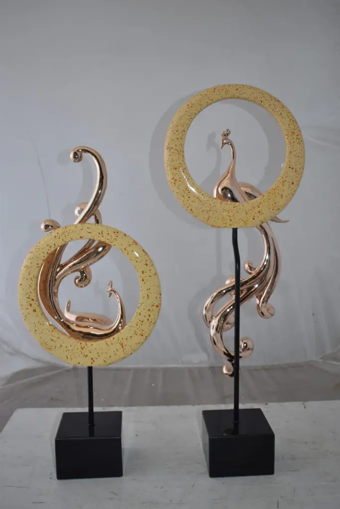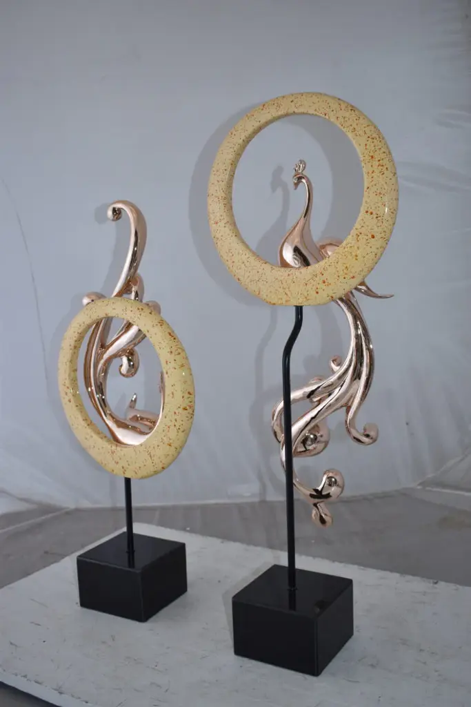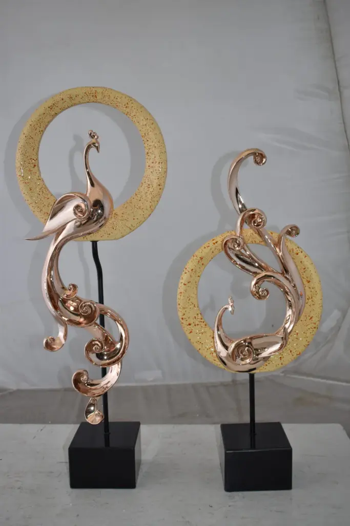Enhance any space with this elegant set of graceful peacocks sitting in front of modern yellow patterned rings. This unique and exquisite rose gold and yellow piece will pair beautifully with modern furniture in any home and will bring beauty and style. Size: 11"L x 6"W x 28"H. Weight is: 13Lb