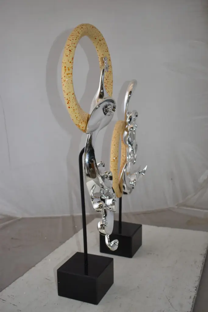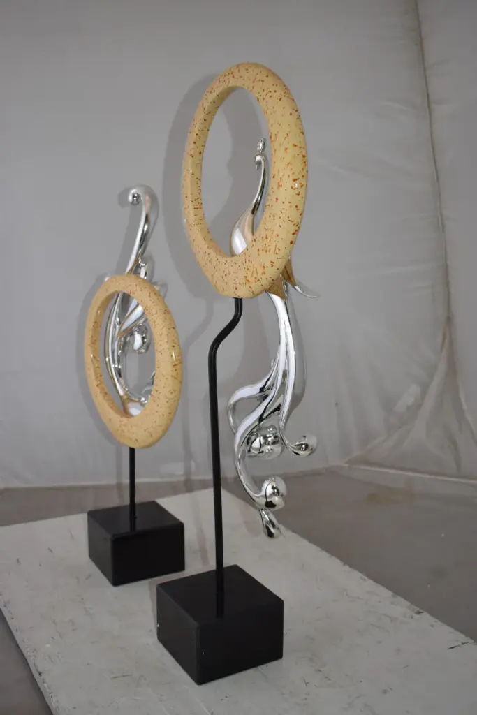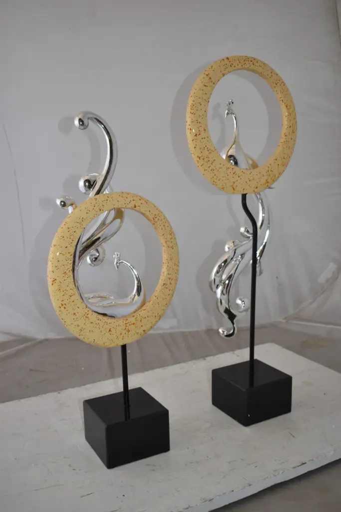 Enhance any space with this elegant set of graceful peacocks sitting in front of modern yellow patterned rings. This unique and exquisite silver and yellow piece will pair beautifully with modern furniture in any home and will bring beauty and style. Size: 11"L x 6"W x 28"H. Weight is: 13Lb