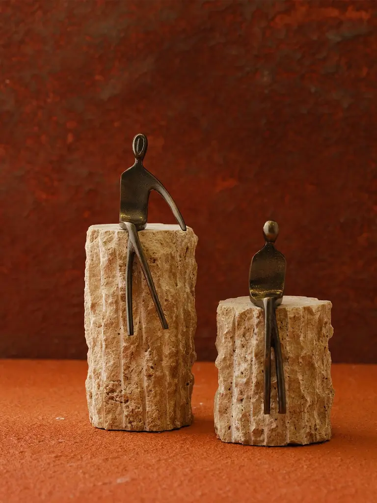 Set Of Two Handmade Travertine Sculpture With Seated Figures
