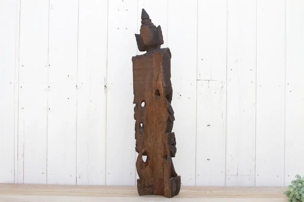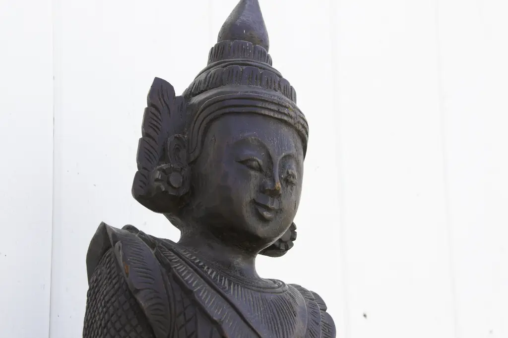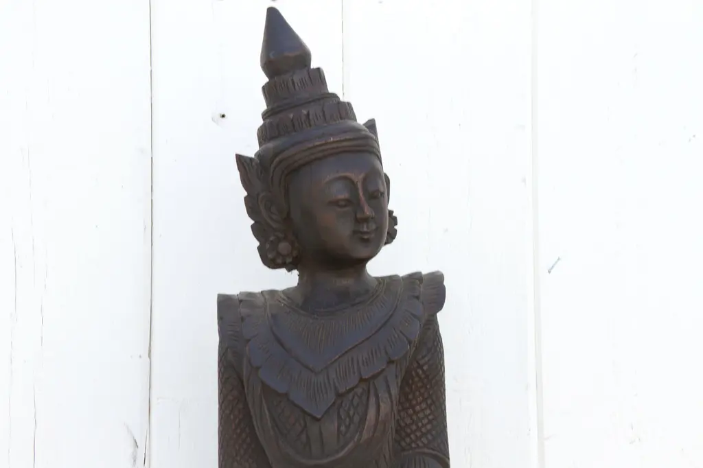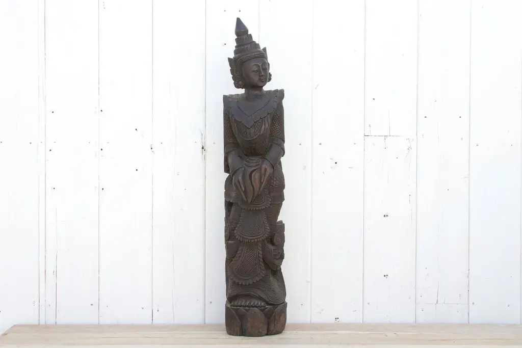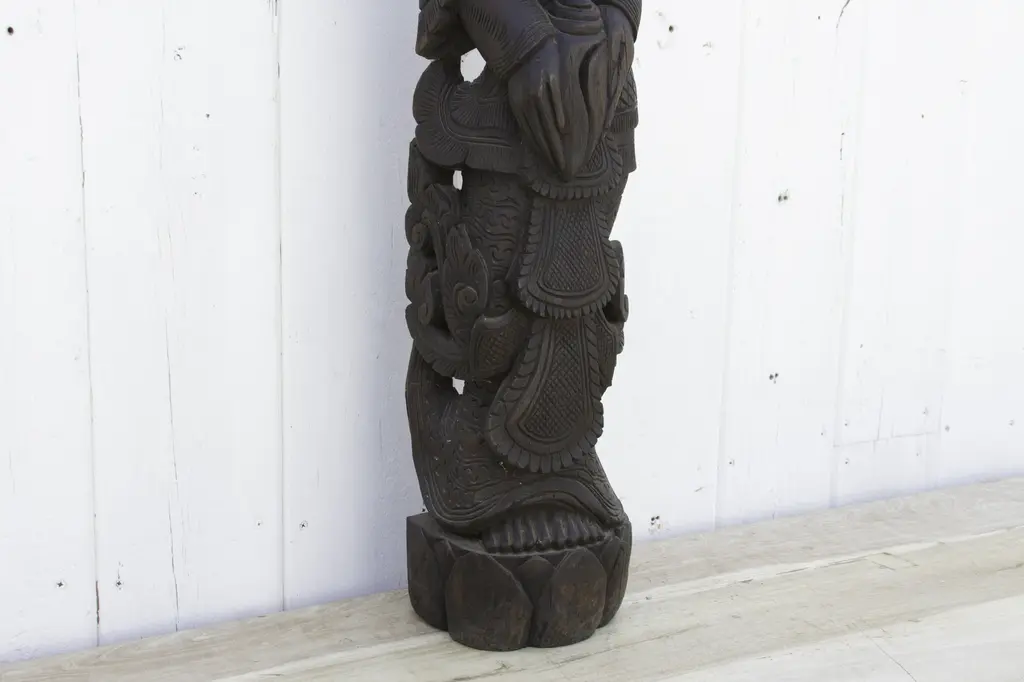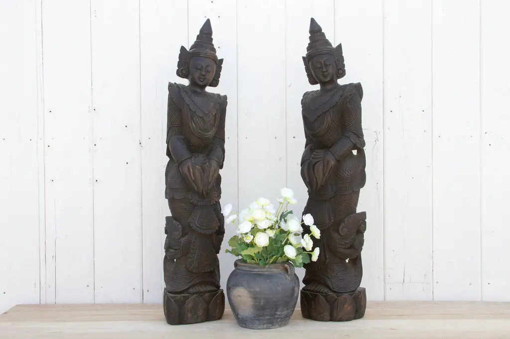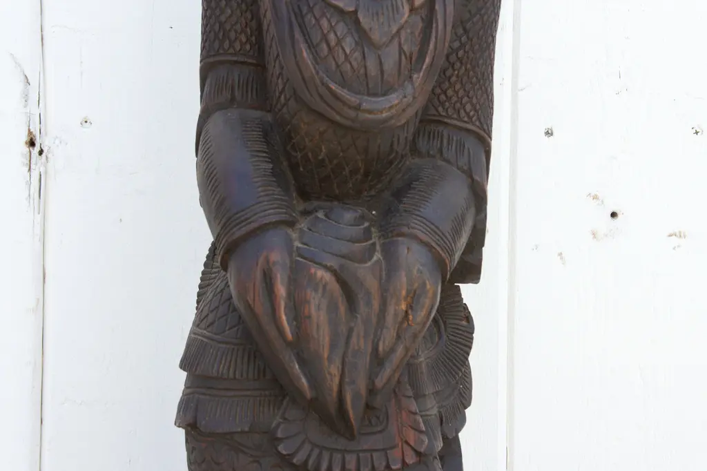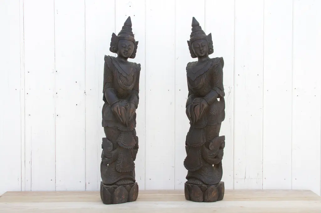 Experience the mystique of the East with this stunning pair of antique carved wood Asian figures, possibly from Bali. These full-length figures in ornate dress are the epitome of grace and elegance, and each holds a seashell, symbolizing the beauty and bounty of the sea. Standing on a lotus base with a rich, patinated dark brown color, these carved Asian statues are a true testament to the timeless artistry of ancient Asian culture.