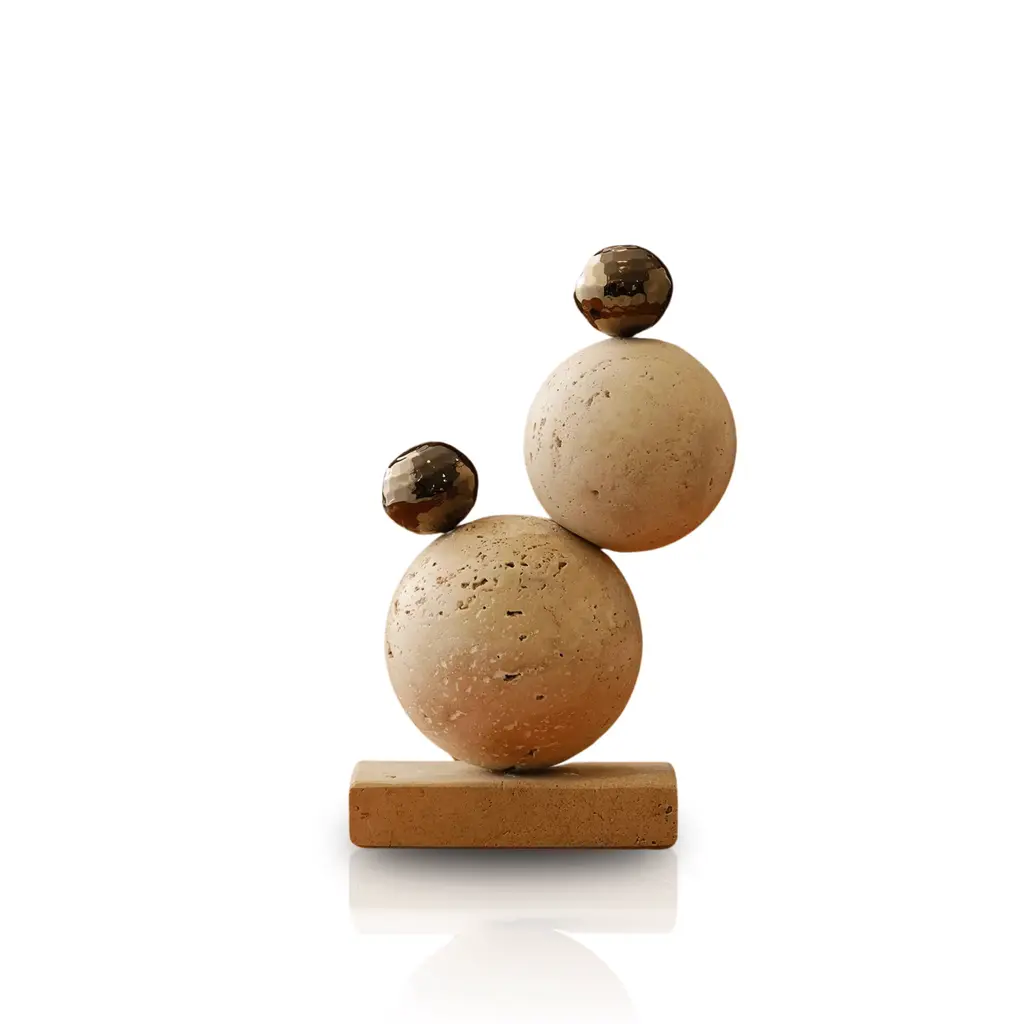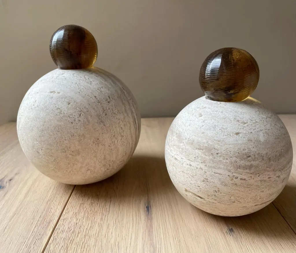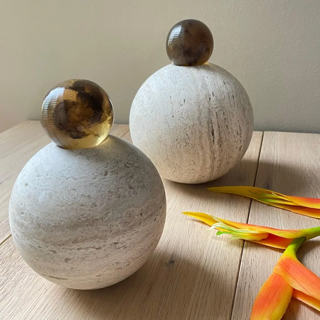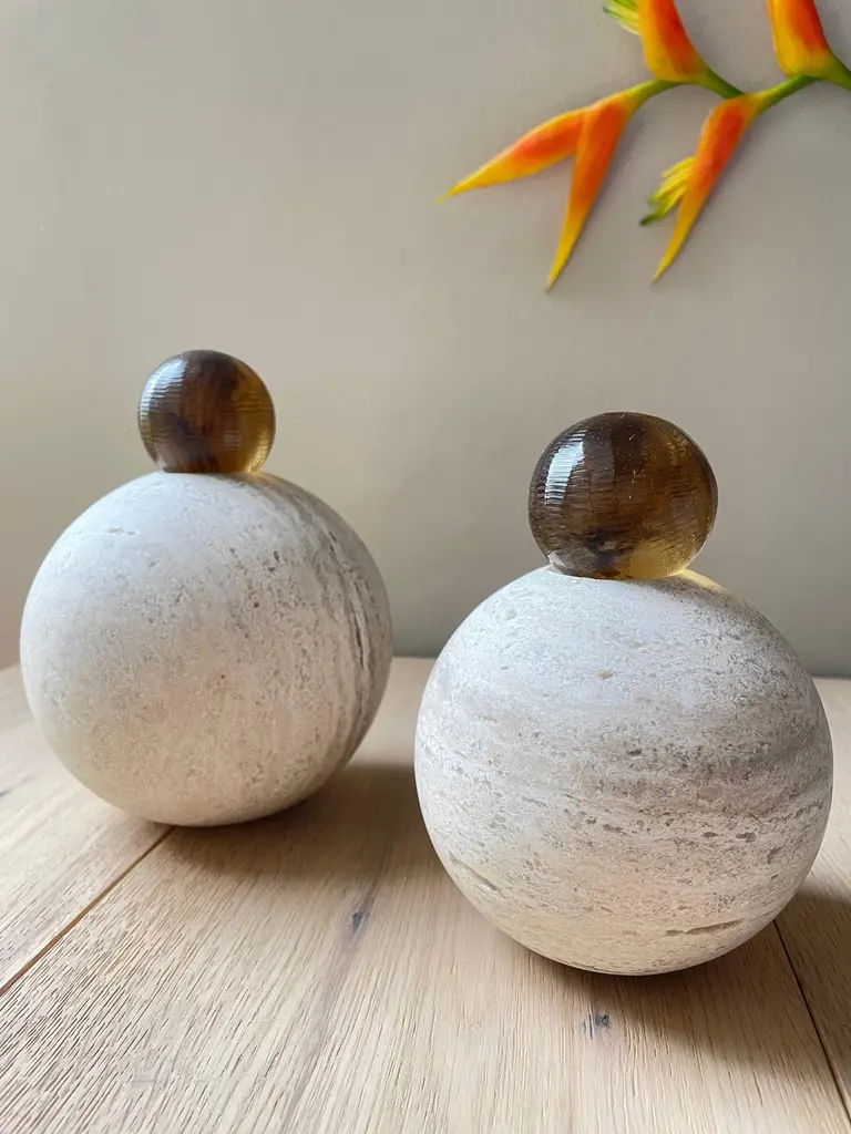Our stack sphere sculptures can be used as a decorative element on a coffee table, bookshelf, console etc. Their warm hue and curved lines add the right amount of visual interest without overwhelming additional decor. The mix of marble and resin make an incredible combo, a mix that is modern, fun and harmonious. You can place the small sphere on top of the big one or you can separate them and create a new piece.They are sold by set of two in different sizes.Material: travertine marble and traslucid brown with marbled brown resin Measurements:Small: Travertine sphere 10 cm diameter and resin sphere 5 cm diameter.Large: Travertine sphere 12 cm diameter and resin sphere 5 cm diameter.Designed by Paola Valle and manufactured in Mexico City by extraordinary artisans. Our goal is to work hand by hand to create outstanding pieces that will represent our passion.Please avoid placing your resin pieces in direct sunlight to avoid discoloration. All resin items are strong and durable but should be treated with care as they can break if dropped or knocked against a hard surface. Colors may vary slightly to the item shown in previous photos, as everything is handmade.Due to the nature of the material every piece will be unique and aesthetically different.