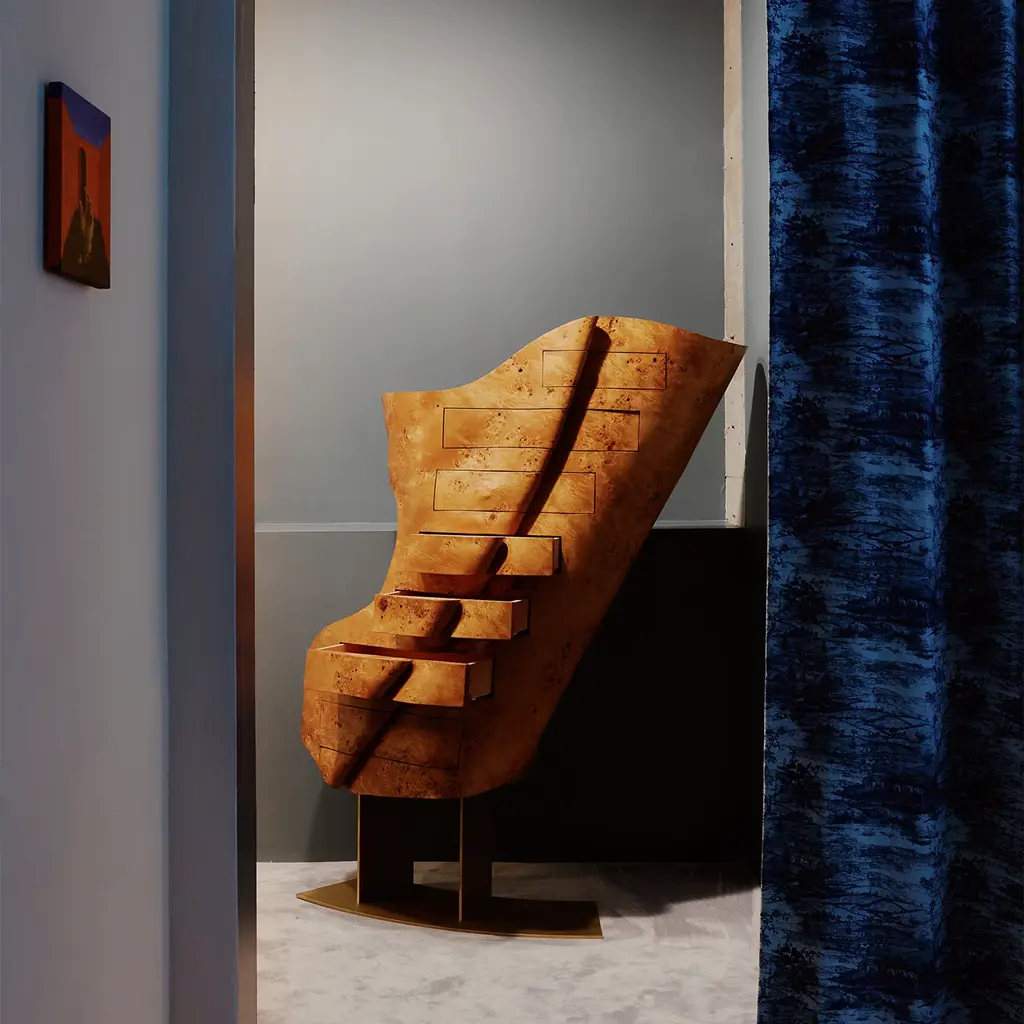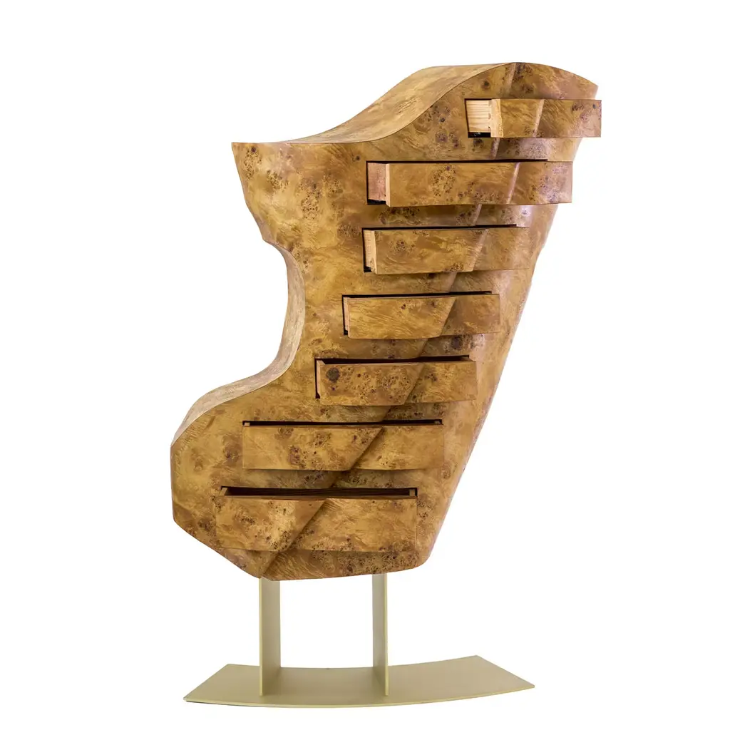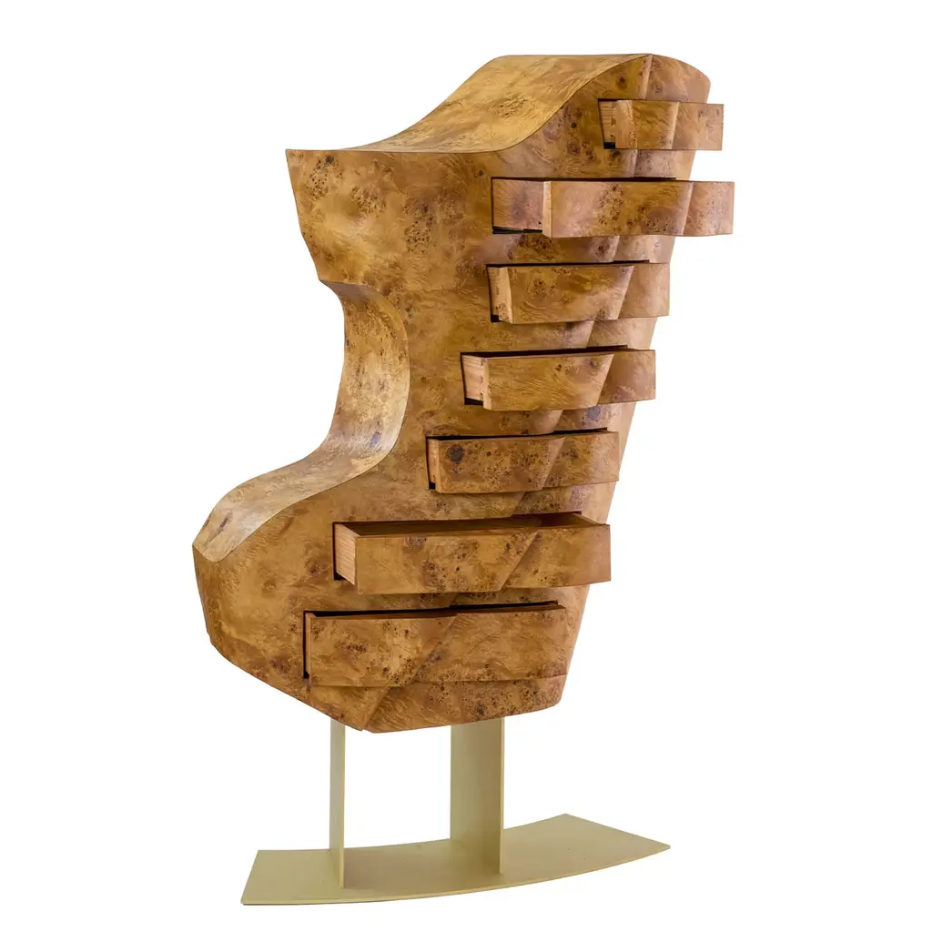 "Settimio" is a “settimino” chest of drawers, composed of a seven-drawer dresser, created with a clear allusion to sculpture, almost as a provocation, that follows the tendency to mix art and design. Limited edition with poplar root wood and brass. This piece is currently on show and immediately available at Artemest Galleria New York.