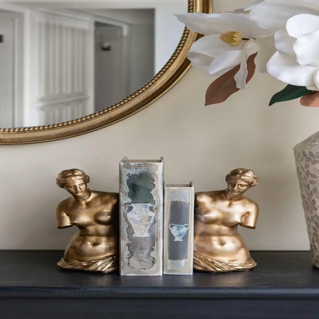 SEVOBAL Party Decorations and Accessories Bookends are a stunning way to add style to your home. Inspired by the classic Venus de Milo sculpture, these gold finish bookends are made from a durable blend of stone powder and resin. Their elegant design complements a variety of decor styles, from traditional to eclectic. These bookends are perfect for holding books while adding a decorative touch to your living room, office, or study.