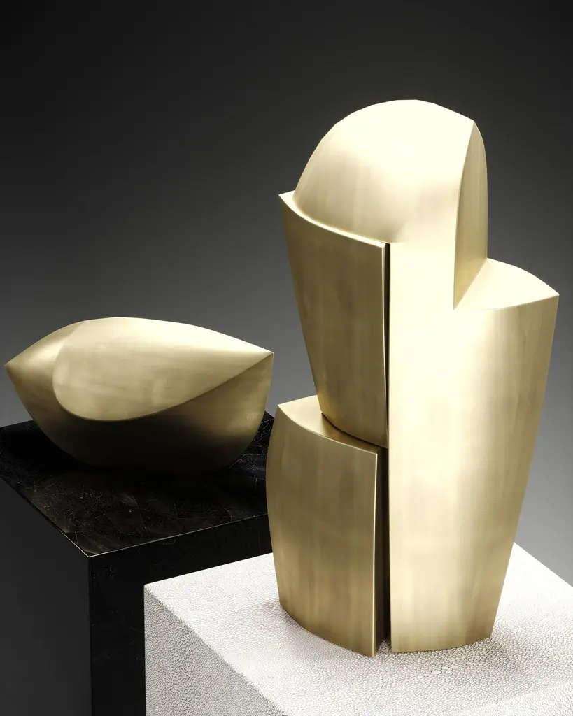 The Paris based label has distinguished themselves since their launch, with their iconic use of shagreen mixed with brass and other exotic materials. All furniture is handcrafted by skilled artisans, ultimately making each piece unique, designed in Paris and produced in the Philippines.This set of 3 columns inlaid in cream shagreen, coal black shagreen and black pen shell by R&Y Augousti and 3 bronze-patina brass abstract sculptures by Patrick Coard Paris, is the ultimate luxury accent pieces for any space. Options to purchase these pieces separately available on individual listings. The dimensions of this piece are Column 1- 29 x 29 x 110 cmColumn 2- 29 x 29 x 90 cmColumn 3- 29 x 29 x 70 cmSculpture 1- 20.5 x 6 x 34 cmSculpture 2- 29 x 13.5 x 16 cmSculpture 3- 19 x 11 x 37 cmAll R&Y Augousti pieces are handmade by artisans, ultimately making each piece unique. Wipe clean with soft dry cloth.Acclaimed design duo Ria & Yiouri Augousti have established themselves since the 1990s as pioneers of modern-vintage style through their luxurious Art Deco inspired collections.The Paris based label has distinguished themselves since their launch, with their iconic use of shagreen mixed with brass and other exotic materials. All furniture is handcrafted by skilled artisans, ultimately making each piece unique. All shagreen-covered items should be kept out of direct sunlight, color variants may occur on the stingray and other exotic finishes, but this showcases the Parisian label's commitment to creating authentic luxurious products using natural components.
