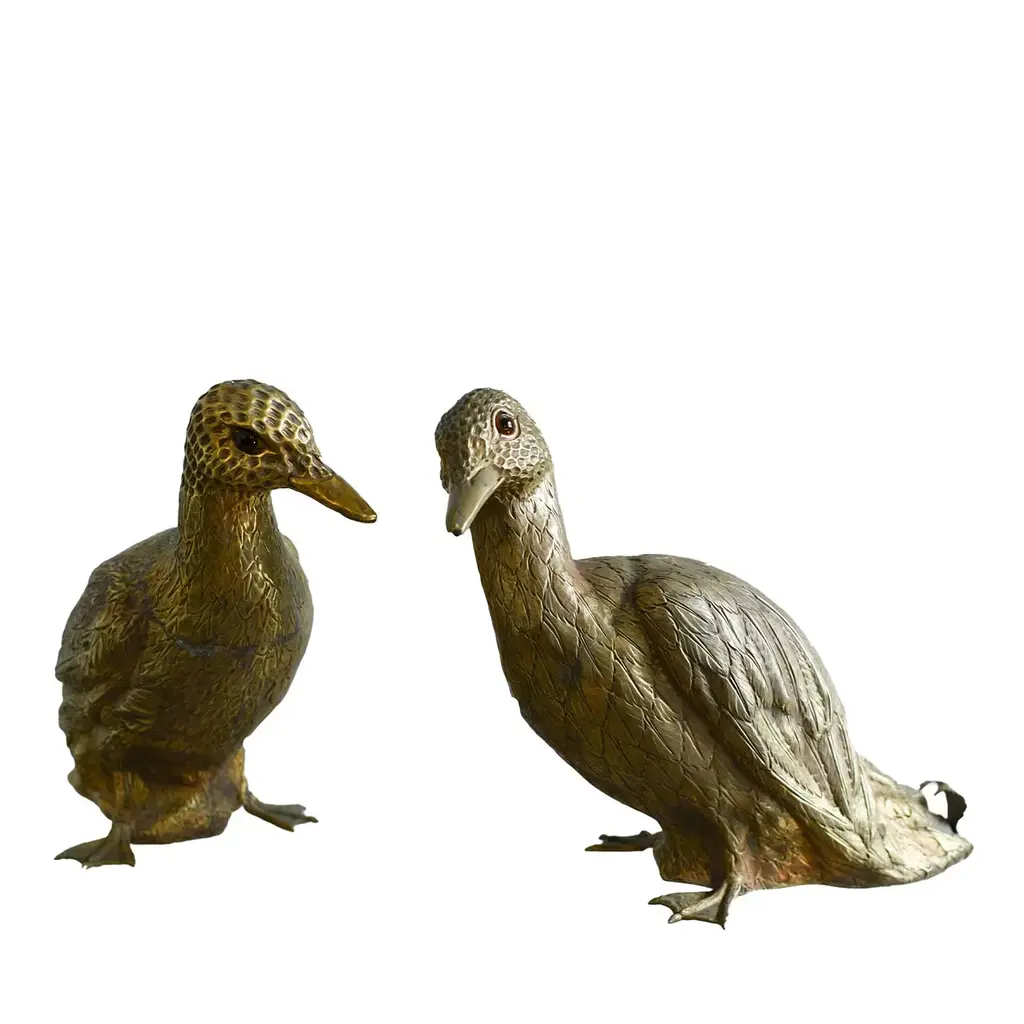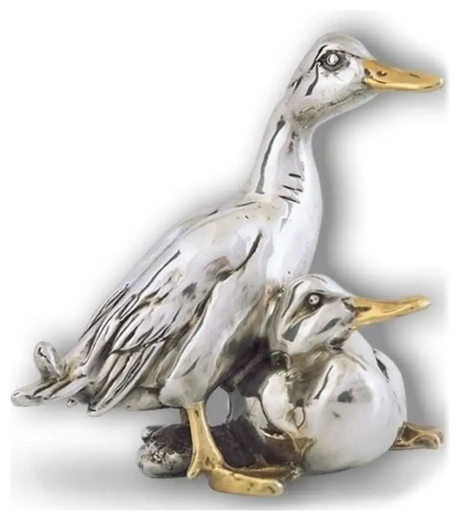 The silver plated geese sculpture from the D''Argenta Collection is artfully produced to make you fall in love with them. This affectionate scene is a beautiful selection for your curio. Accented in 24K gold. Weighs 1. 21 lbs. and measures 4. 92" x 4. 72". About D''Argenta Silver EleganceOrnate in design, exquisite in detail, and beautifully elegant, the Sterling Silver Plated products created by the artists of D''Argenta Silver Elegance are the perfect heirloom quality pieces for any home. The distinctive sterling silver designs stand out against the black neillo inlay and the intricate detail is breathtakingly attractive. D''Argenta Silver Sculptures and objects d''art offer unparalleled excellence in quality and exquisite attention to detail, because they are the hallmarks that have established D''Argenta as a leader in the export of precious metal-finished art for over a quarter of a century. Each of the over 200 limited-edition sculptures, personally signed by the artist, is technically flawless yet competitively priced..the same master-craftsmanship received in pieces that have been gifted to royalty, heads of state and the Vatican. From the surface detail of the innumerable tumuli and broad swells that impart the hides of the elephant collection to the graceful lines that capture the motion of a stallion''s gallop, you will marvel at the beauty of your truly unique acquisition as it graces a special place in your home. Historically, sculptures composed of precious metals were crafted using the traditional hot casting process. 25 years ago, the artisans at renowned metal art company D''Argenta introduced an advanced new metalworking technique that changed the way precious metals are sculpted. D''Argenta''s new method combined cold casting and electroforming to create intricate, finely detailed sculptures. The pieces are initially plated with a . 015 inch (400 micro) thick layer of copper, then plated with silver or (24K) gold at a thickness of . 001 inch (24 micro). Each sculpture''s interior is composed of a polyester fiberglass core that strengthens sleek metal plating. After being formed, each piece is coated with a protective lacquer to prevents tarnishing and maintain luster. This final step ensures that all D''Argenta sculptures, though crafted with fine silver, do not require polish or any type of metal cleaner and can be simply dusted with a dry cloth as needed. Exported around the world and now available in over 25 countries, D''Aragenta''s products have won international acclaim because of their innovative construction and exquisite beauty. In 1981, D''Argenta was recognized with the Bulgarian Government Gold Medal award. In 1992, a D''Argenta sculpture was gifted to His Royal Highness Prince Naruhito of Japan on a visit to Mexico. A nod to the company''s exclusive prestige, D''Argenta sculptures have been gifted to an increasingly long list of dignitaries, including Pope John Paul II, Prince Phillip of England, and his Majesty King Harald of Norway. The gifted artists of D''Argenta include: Manuel Alvarado, Ricardo Del Rio, Enrique Jolly, Javier Arenas Perez, Claudio Rodr
