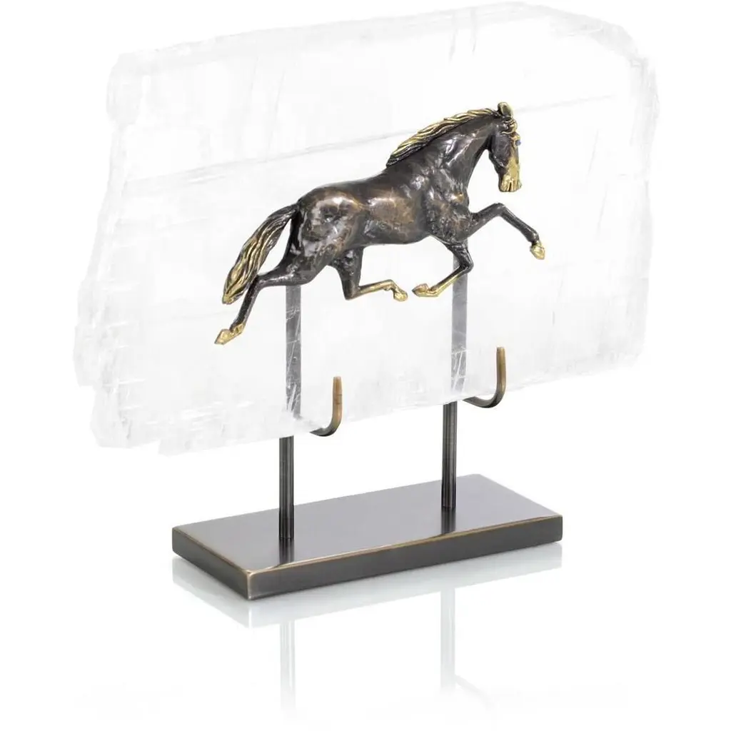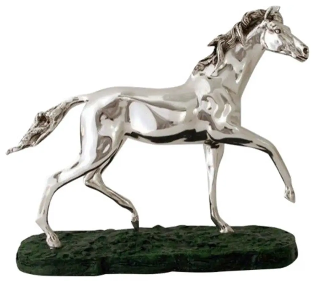 Silver plated horse sculpture by Ricardo del Rio and D''Argenta Silver Elegance. This contemporary piece captures the strength and spirit of this beautiful stallion as it prances masterfully across the field. Simply stunning, and deserving of a conspicuous spot for display in your home. Weighs 11. 01 lbs. About D''Argenta Silver EleganceOrnate in design, exquisite in detail, and beautifully elegant, the Sterling Silver Plated products created by the artists of D''Argenta Silver Elegance are the perfect heirloom quality pieces for any home. The distinctive sterling silver designs stand out against the black neillo inlay and the intricate detail is breathtakingly attractive. D''Argenta Silver Sculptures and objects d''art offer unparalleled excellence in quality and exquisite attention to detail, because they are the hallmarks that have established D''Argenta as a leader in the export of precious metal-finished art for over a quarter of a century. Each of the over 200 limited-edition sculptures, personally signed by the artist, is technically flawless yet competitively priced..the same master-craftsmanship received in pieces that have been gifted to royalty, heads of state and the Vatican. From the surface detail of the innumerable tumuli and broad swells that impart the hides of the elephant collection to the graceful lines that capture the motion of a stallion''s gallop, you will marvel at the beauty of your truly unique acquisition as it graces a special place in your home. Historically, sculptures composed of precious metals were crafted using the traditional hot casting process. 25 years ago, the artisans at renowned metal art company D''Argenta introduced an advanced new metalworking technique that changed the way precious metals are sculpted. D''Argenta''s new method combined cold casting and electroforming to create intricate, finely detailed sculptures. The pieces are initially plated with a . 015 inch (400 micro) thick layer of copper, then plated with silver or (24K) gold at a thickness of . 001 inch (24 micro). Each sculpture''s interior is composed of a polyester fiberglass core that strengthens sleek metal plating. After being formed, each piece is coated with a protective lacquer to prevents tarnishing and maintain luster. This final step ensures that all D''Argenta sculptures, though crafted with fine silver, do not require polish or any type of metal cleaner and can be simply dusted with a dry cloth as needed. Exported around the world and now available in over 25 countries, D''Aragenta''s products have won international acclaim because of their innovative construction and exquisite beauty. In 1981, D''Argenta was recognized with the Bulgarian Government Gold Medal award. In 1992, a D''Argenta sculpture was gifted to His Royal Highness Prince Naruhito of Japan on a visit to Mexico. A nod to the company''s exclusive prestige, D''Argenta sculptures have been gifted to an increasingly long list of dignitaries, including Pope John Paul II, Prince Phillip of England, and his Majesty King Harald of Norway. The gifted artists of D''Argenta include: Manuel Alvarado, Ricardo Del Rio, Enrique Jolly, Javier Arenas Perez, Claudio Rodr