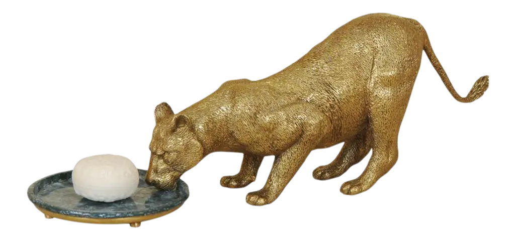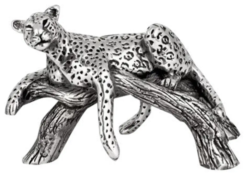 The silver plated leopard mother and cubs sculpture by artist Ricardo del Rio and D''Argenta Silver Accents is an exquisite piece d''art. The stunning detail faithfully captures a leopardess on a tree limb cleaning her cub, while another playfully prowls at her tail. This leopard sculpture is evidence of D''Aragenta''s quest for quality in both material and craftsmanship. Each creation reflects the incomparable D''Argenta style, design, finish and exquisite beauty. This wonderful piece is just one of the many feline sculptures by D''Argenta. Weight: approx. 1 lbs. About D''Argenta Silver EleganceOrnate in design, exquisite in detail, and beautifully elegant, the Sterling Silver Plated products created by the artists of D''Argenta Silver Elegance are the perfect heirloom quality pieces for any home. The distinctive sterling silver designs stand out against the black neillo inlay and the intricate detail is breathtakingly attractive. D''Argenta Silver Sculptures and objects d''art offer unparalleled excellence in quality and exquisite attention to detail, because they are the hallmarks that have established D''Argenta as a leader in the export of precious metal-finished art for over a quarter of a century. Each of the over 200 limited-edition sculptures, personally signed by the artist, is technically flawless yet competitively priced..the same master-craftsmanship received in pieces that have been gifted to royalty, heads of state and the Vatican. From the surface detail of the innumerable tumuli and broad swells that impart the hides of the elephant collection to the graceful lines that capture the motion of a stallion''s gallop, you will marvel at the beauty of your truly unique acquisition as it graces a special place in your home. Historically, sculptures composed of precious metals were crafted using the traditional hot casting process. 25 years ago, the artisans at renowned metal art company D''Argenta introduced an advanced new metalworking technique that changed the way precious metals are sculpted. D''Argenta''s new method combined cold casting and electroforming to create intricate, finely detailed sculptures. The pieces are initially plated with a . 015 inch (400 micro) thick layer of copper, then plated with silver or (24K) gold at a thickness of . 001 inch (24 micro). Each sculpture''s interior is composed of a polyester fiberglass core that strengthens sleek metal plating. After being formed, each piece is coated with a protective lacquer to prevents tarnishing and maintain luster. This final step ensures that all D''Argenta sculptures, though crafted with fine silver, do not require polish or any type of metal cleaner and can be simply dusted with a dry cloth as needed. Exported around the world and now available in over 25 countries, D''Aragenta''s products have won international acclaim because of their innovative construction and exquisite beauty. In 1981, D''Argenta was recognized with the Bulgarian Government Gold Medal award. In 1992, a D''Argenta sculpture was gifted to His Royal Highness Prince Naruhito of Japan on a visit to Mexico. A nod to the company''s exclusive prestige, D''Argenta sculptures have been gifted to an increasingly long list of dignitaries, including Pope John Paul II, Prince Phillip of England, and his Majesty King Harald of Norway. The gifted artists of D''Argenta include: Manuel Alvarado, Ricardo Del Rio, Enrique Jolly, Javier Arenas Perez, Claudio Rodr