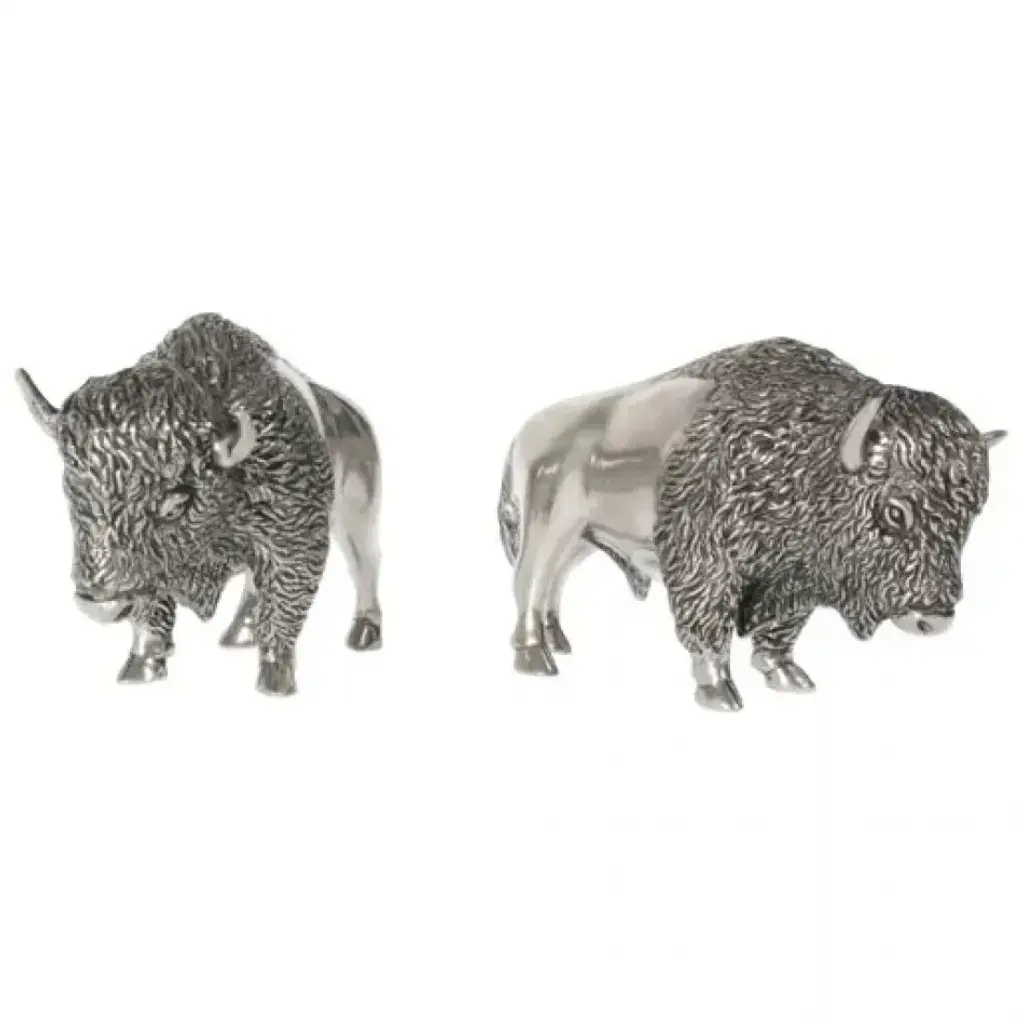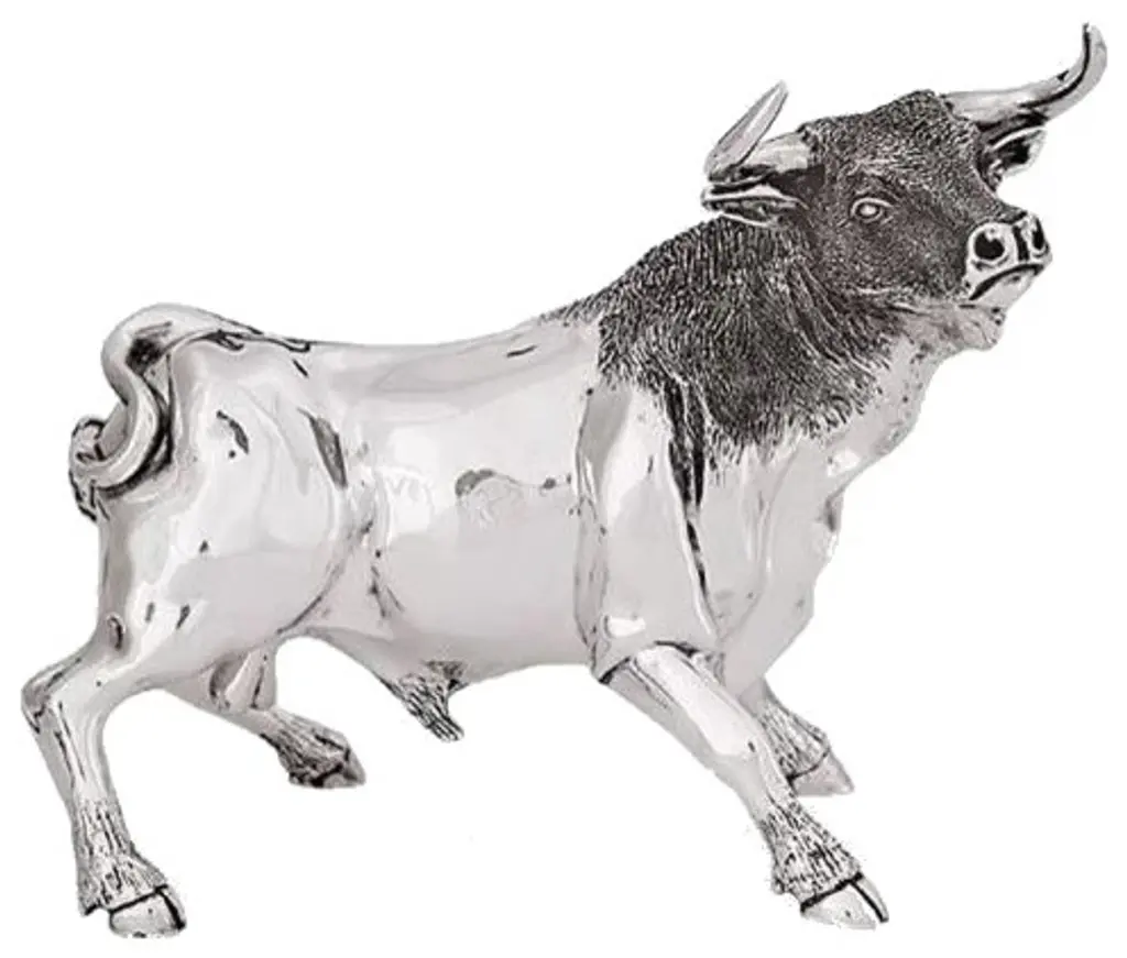 Silver plated bull sculpture by D''Argenta and artist Claudio Rodriguez. This powerful and majestic bull is has been captured in a pose of alert readiness. His strength and dominant attitude come through clearly in this wonderfully detailed creation. This piece is the ideal gift for power-executives or the centerpiece for your home or office. Weighs 7. 27 lbs. Limited to an edition of 500 pieces, each has been signed and numbered by the artist. This sculpture is spectacular in its quality and rendition. Weight: approx. 9 lbs. About D''Argenta Silver EleganceOrnate in design, exquisite in detail, and beautifully elegant, the Sterling Silver Plated products created by the artists of D''Argenta Silver Elegance are the perfect heirloom quality pieces for any home. The distinctive sterling silver designs stand out against the black neillo inlay and the intricate detail is breathtakingly attractive. D''Argenta Silver Sculptures and objects d''art offer unparalleled excellence in quality and exquisite attention to detail, because they are the hallmarks that have established D''Argenta as a leader in the export of precious metal-finished art for over a quarter of a century. Each of the over 200 limited-edition sculptures, personally signed by the artist, is technically flawless yet competitively priced..the same master-craftsmanship received in pieces that have been gifted to royalty, heads of state and the Vatican. From the surface detail of the innumerable tumuli and broad swells that impart the hides of the elephant collection to the graceful lines that capture the motion of a stallion''s gallop, you will marvel at the beauty of your truly unique acquisition as it graces a special place in your home. Historically, sculptures composed of precious metals were crafted using the traditional hot casting process. 25 years ago, the artisans at renowned metal art company D''Argenta introduced an advanced new metalworking technique that changed the way precious metals are sculpted. D''Argenta''s new method combined cold casting and electroforming to create intricate, finely detailed sculptures. The pieces are initially plated with a . 015 inch (400 micro) thick layer of copper, then plated with silver or (24K) gold at a thickness of . 001 inch (24 micro). Each sculpture''s interior is composed of a polyester fiberglass core that strengthens sleek metal plating. After being formed, each piece is coated with a protective lacquer to prevents tarnishing and maintain luster. This final step ensures that all D''Argenta sculptures, though crafted with fine silver, do not require polish or any type of metal cleaner and can be simply dusted with a dry cloth as needed. Exported around the world and now available in over 25 countries, D''Aragenta''s products have won international acclaim because of their innovative construction and exquisite beauty. In 1981, D''Argenta was recognized with the Bulgarian Government Gold Medal award. In 1992, a D''Argenta sculpture was gifted to His Royal Highness Prince Naruhito of Japan on a visit to Mexico. A nod to the company''s exclusive prestige, D''Argenta sculptures have been gifted to an increasingly long list of dignitaries, including Pope John Paul II, Prince Phillip of England, and his Majesty King Harald of Norway. The gifted artists of D''Argenta include: Manuel Alvarado, Ricardo Del Rio, Enrique Jolly, Javier Arenas Perez, Claudio Rodr