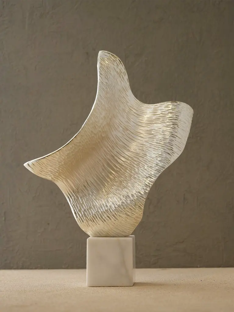 Elevate your space with the Silver Ripple Sculpture, a striking piece that seamlessly blends modern artistry and organic fluidity. Crafted in a wave-like form with a textured silver finish, this decor piece captures the interplay of light and shadow, creating a captivating focal point in any room. Perfect for minimalist, contemporary, or luxurious interiors, this sculpture adds a sense of movement and refined sophistication to your home.