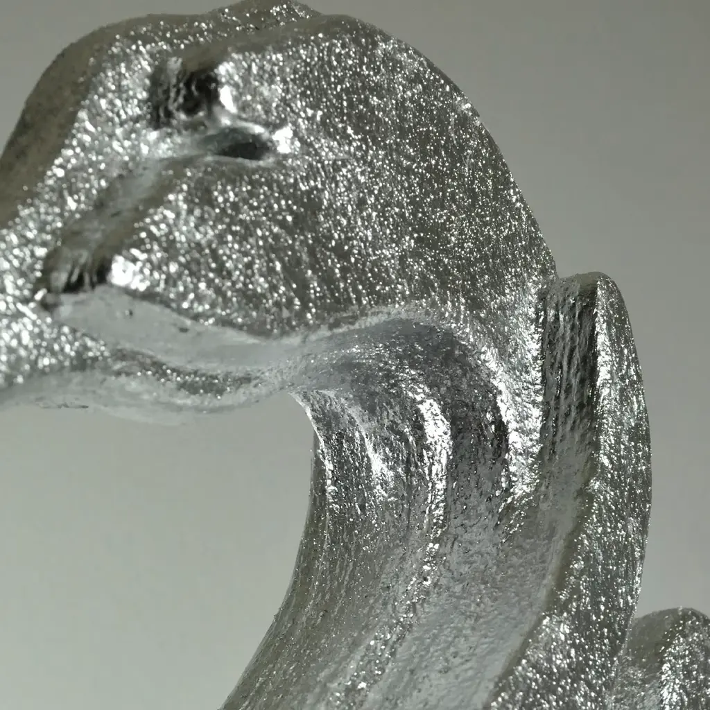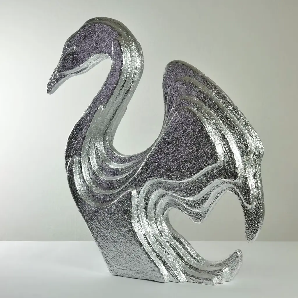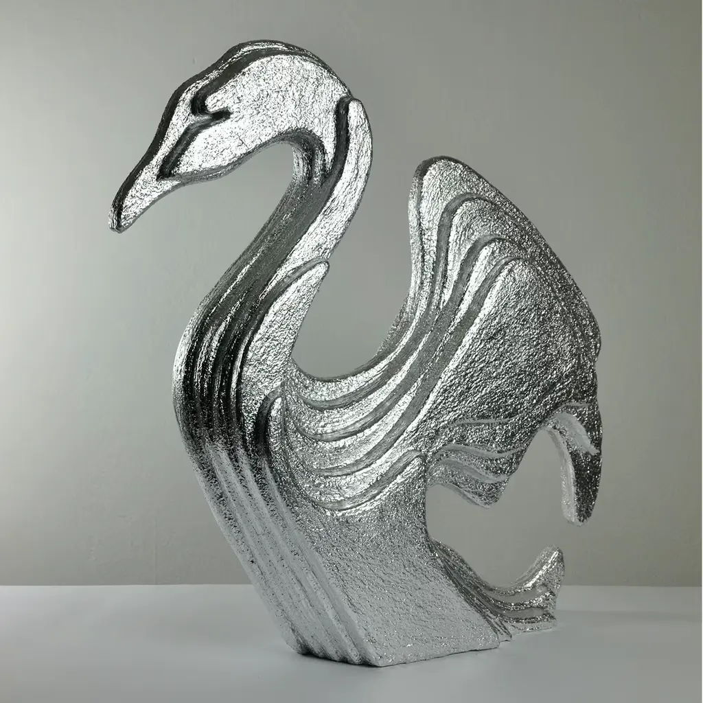 A layered design preciously covered in silver leaf and sinuous, stylized contours mark the sublime silhouette of this artful sculpture shaped like an elegant swan. Finished with plaster applied in relief, it is deftly crafted from extruded polyurethane and boasts generous dimensions that further contribute to its statement-making potential, especially when hit by a stream of light.
