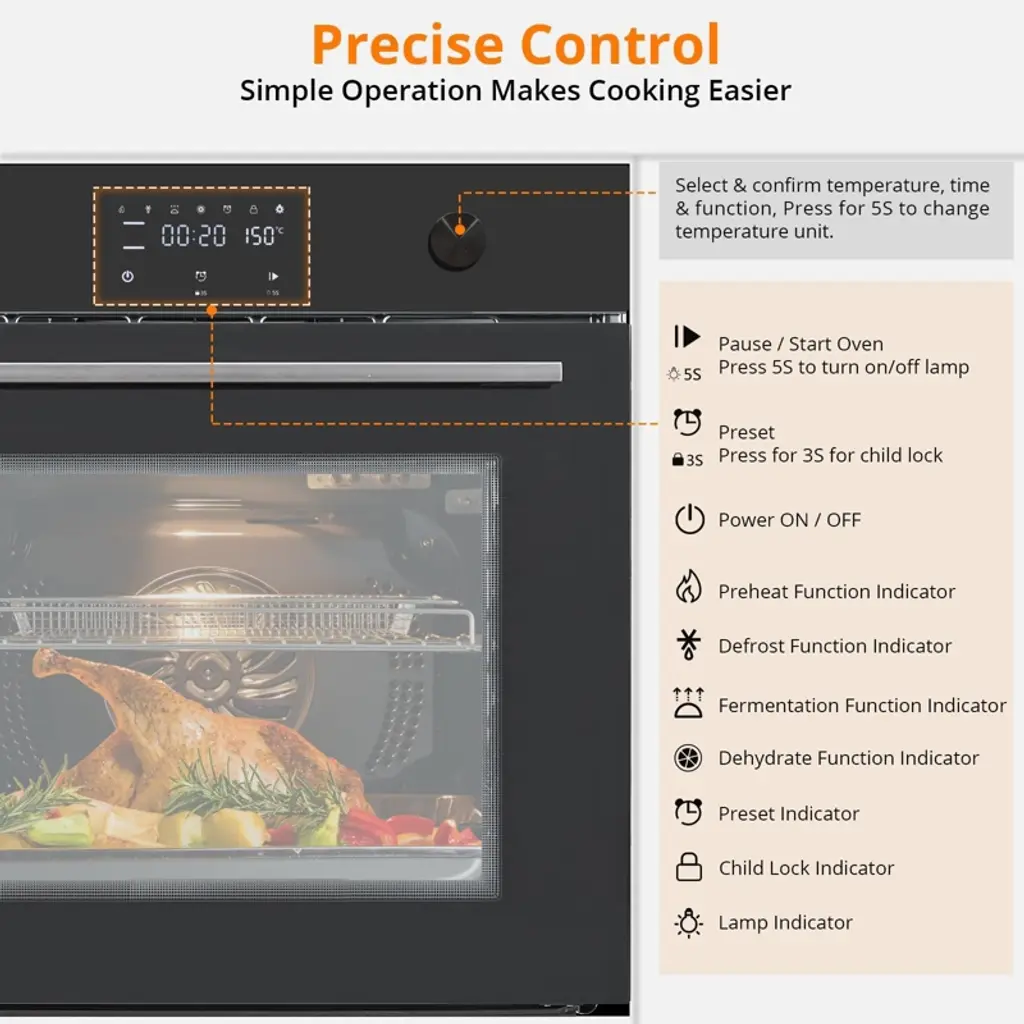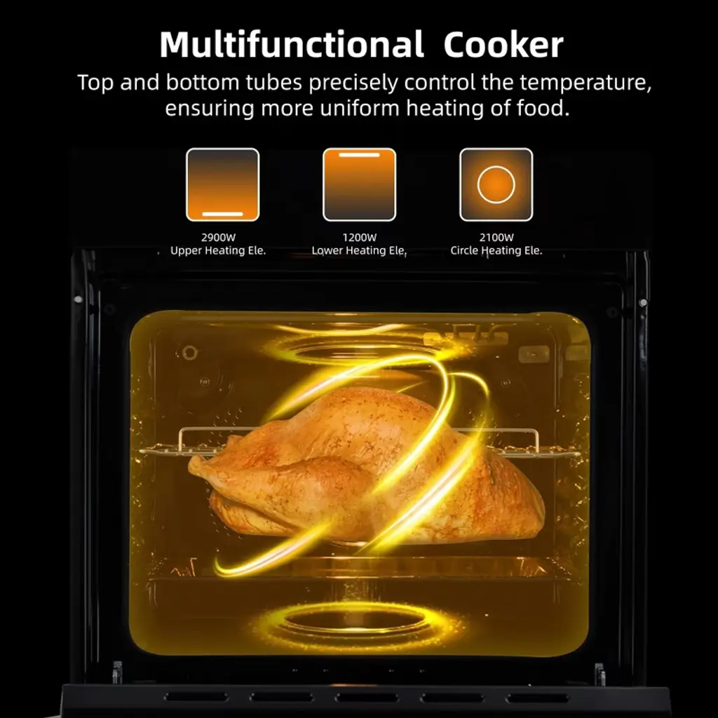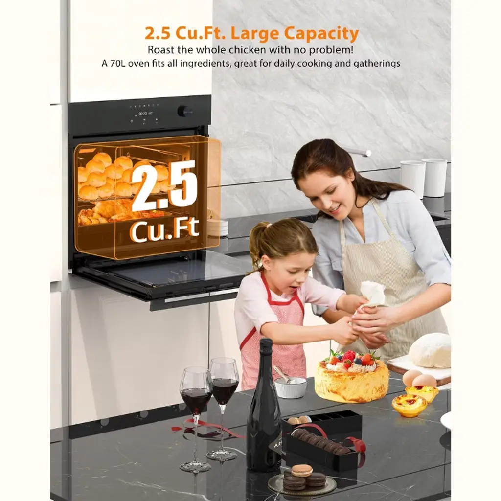 With a robust 3000W heating element and a 240V power supply, this oven ensures rapid and efficient cooking, while the spacious 2.5 cu.ft capacity accommodates a variety of dishes effortlessly. The convection feature promotes even heat distribution, resulting in perfectly cooked meals every time. Crafted from high-quality stainless steel, this oven combines durability with a modern aesthetic that complements any kitchen decor. The user-friendly touch screen interface allows for easy operation, enabling you to select from various cooking modes and settings with just a tap. Elevate your cooking experience and enjoy delicious, home-cooked meals with this exceptional built-in wall oven