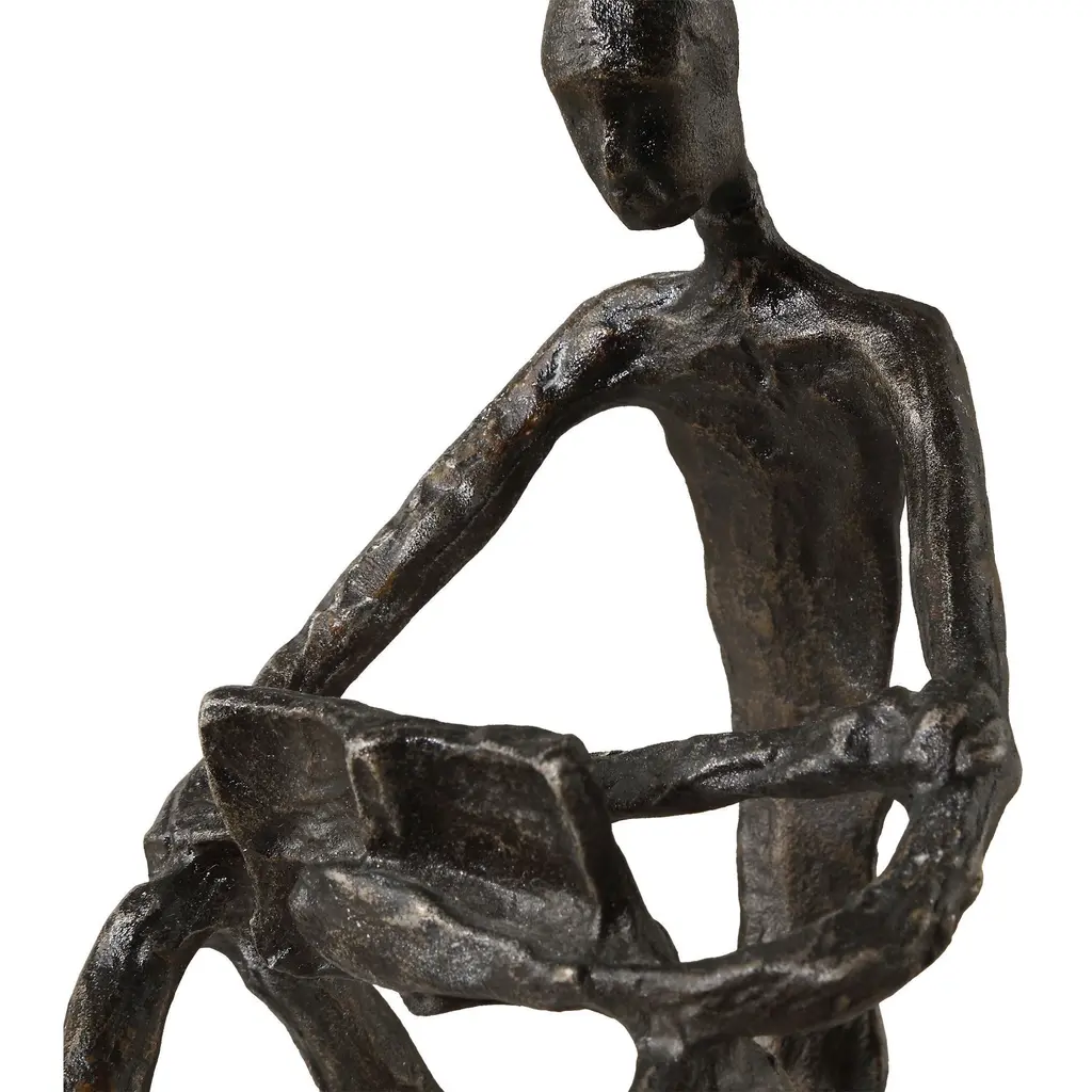 This Sculpture Captures The Essence Of Tranquility As It Depicts A Figure In A Relaxed Seated Position, Engrossed In The Simple Pleasure Of Reading. The Cast Iron Figure Is Finished In Dark Brown, Enriched With Bronze Highlights, And Sits Atop A White Marble Base. This Visually Stunning Piece Effortlessly Complements Any Space.