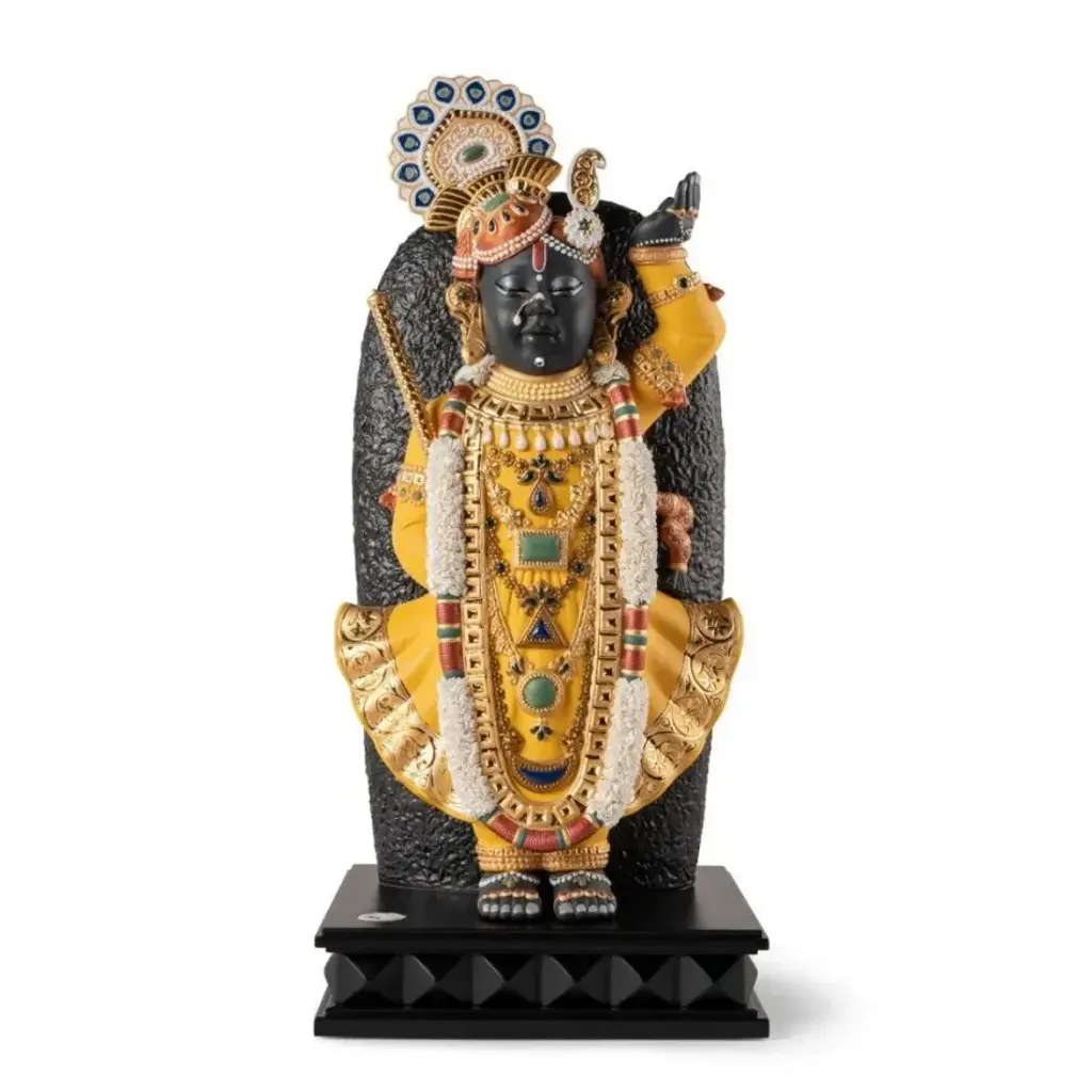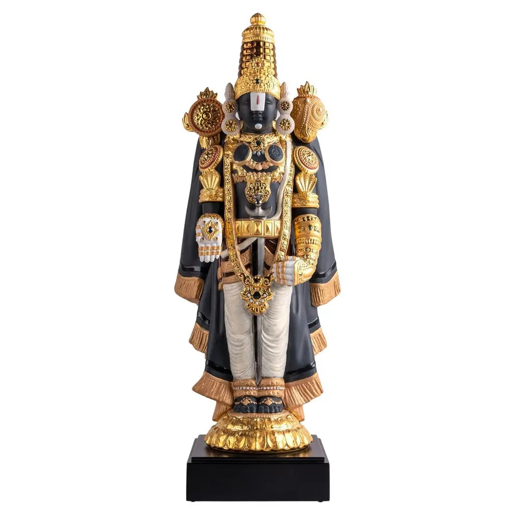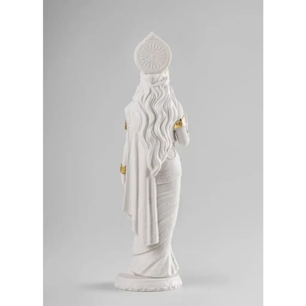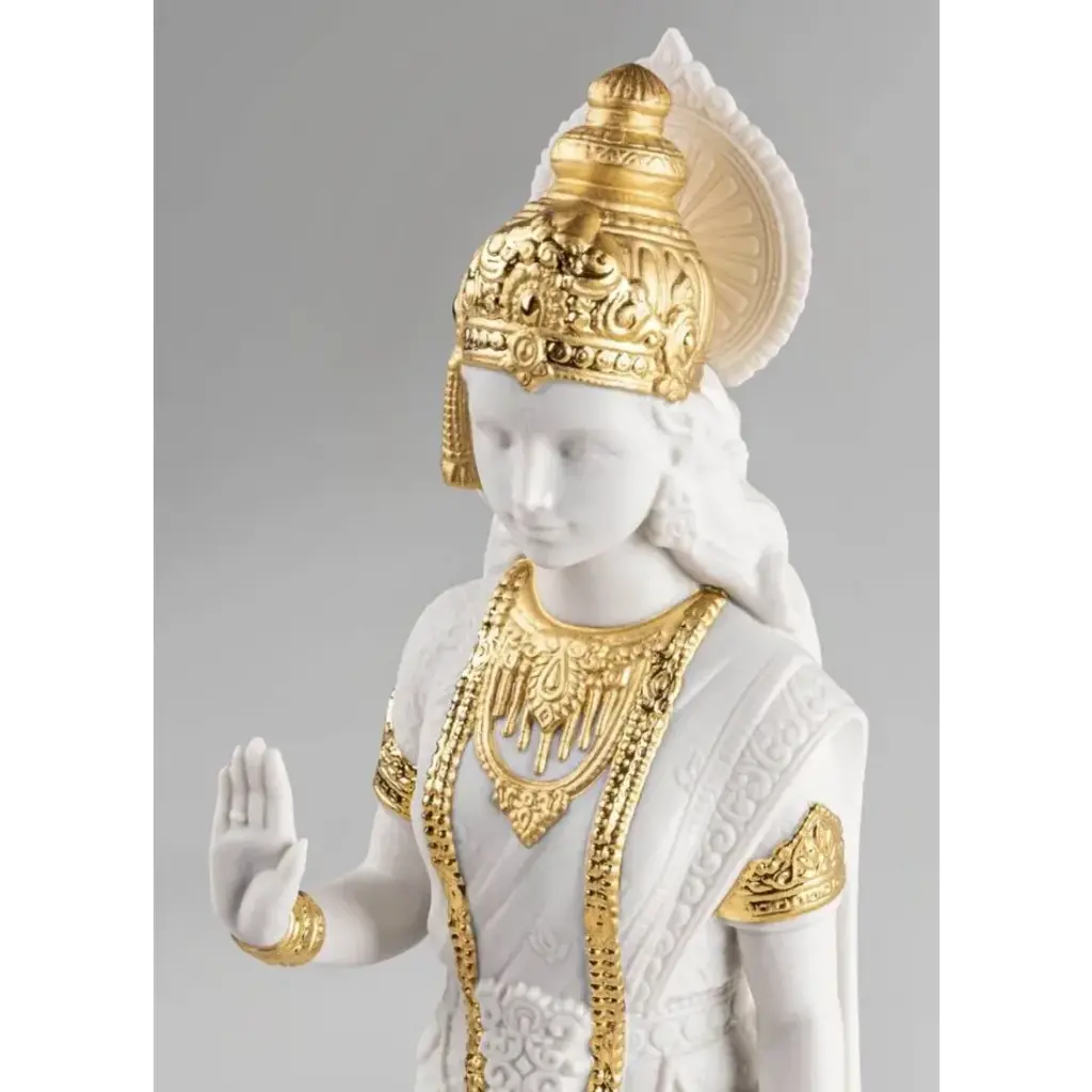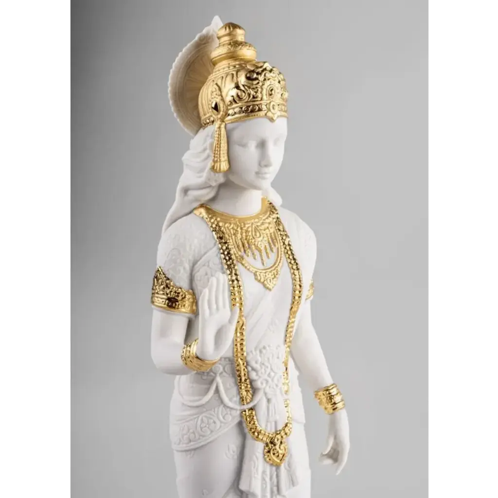 Sculpture of the mythical Hindu character Sita made in matte porcelain and golden luster. An iconic Spanish brand, Lladro is a world leader in the creation of porcelain art. Started by brothers Juan, Jose and Vicente Lladro in 1953, the ceramic figurines were initially inspired by the works of great European manufacturers like Meissen and Sevres. Over time, a unique style was forged, consisting of elongated lines, a revolutionary single-firing method, and soft pastel tones.