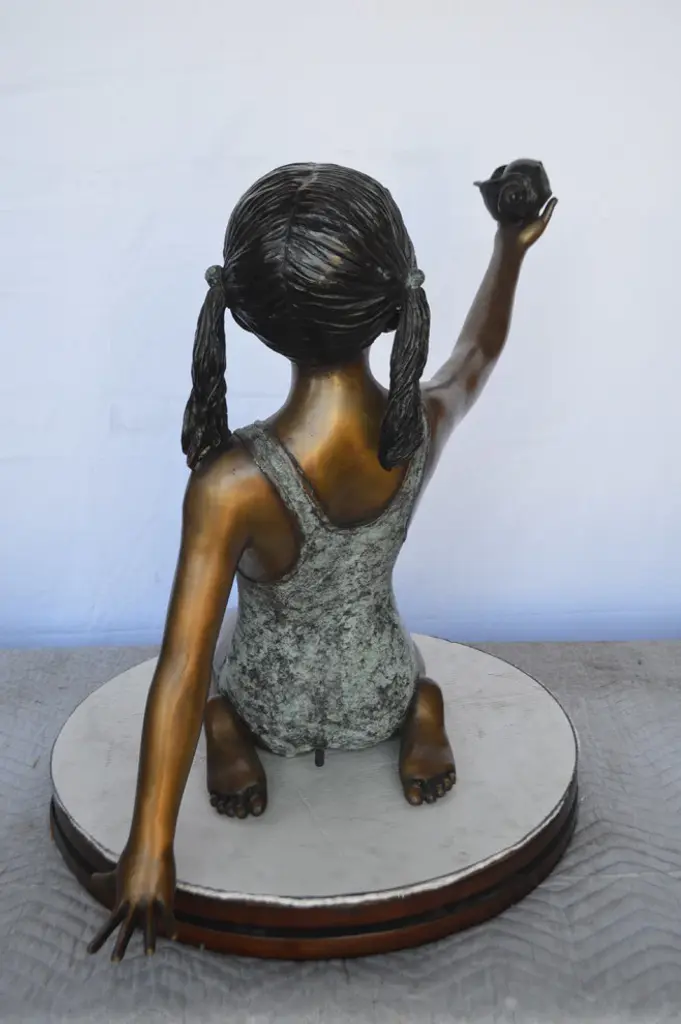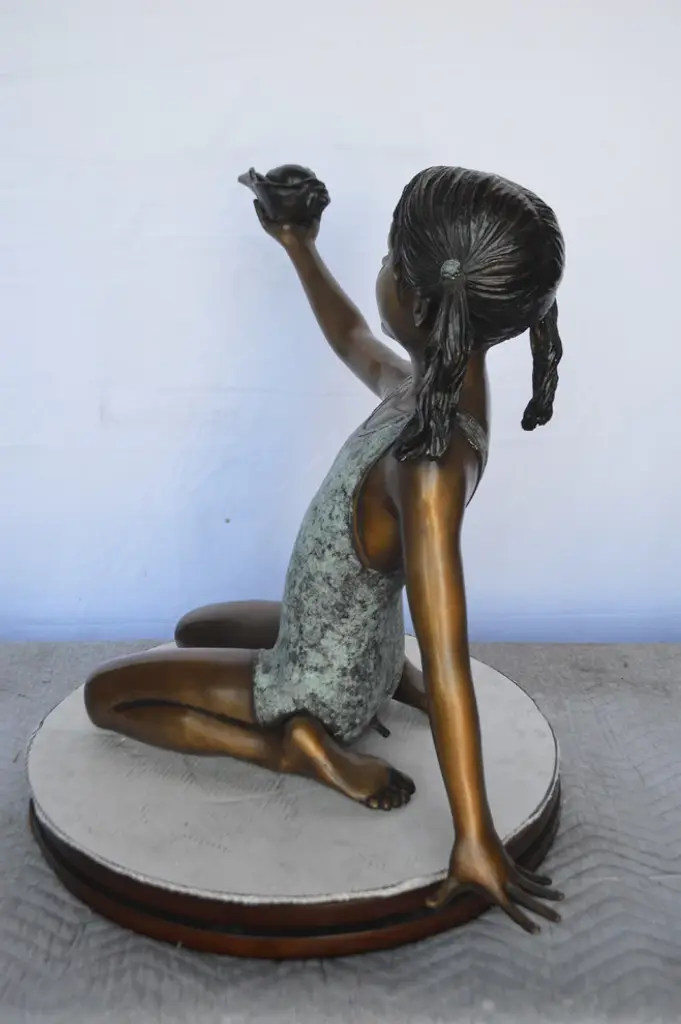 Sculpted beautiful fountain of a girl holding a seashell bronze Sculpture. Water spills out from the seashell with the use of a fountain pump (pump not included). This Sculpture is a finely crafted, highly detailed work of art. You will be very pleased with the quality of this amazing Sculpture - Fountain. This bronze Sculpture was cast using the lost Wax Method. This impressive Bronze Statue will be a permanent fixture on the grounds of your estate for years to come. Size: 32"L x 22"W x 25"H. Weight is: 33Lb