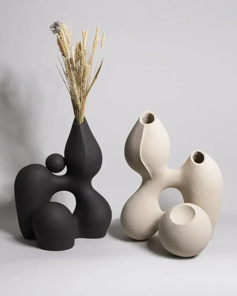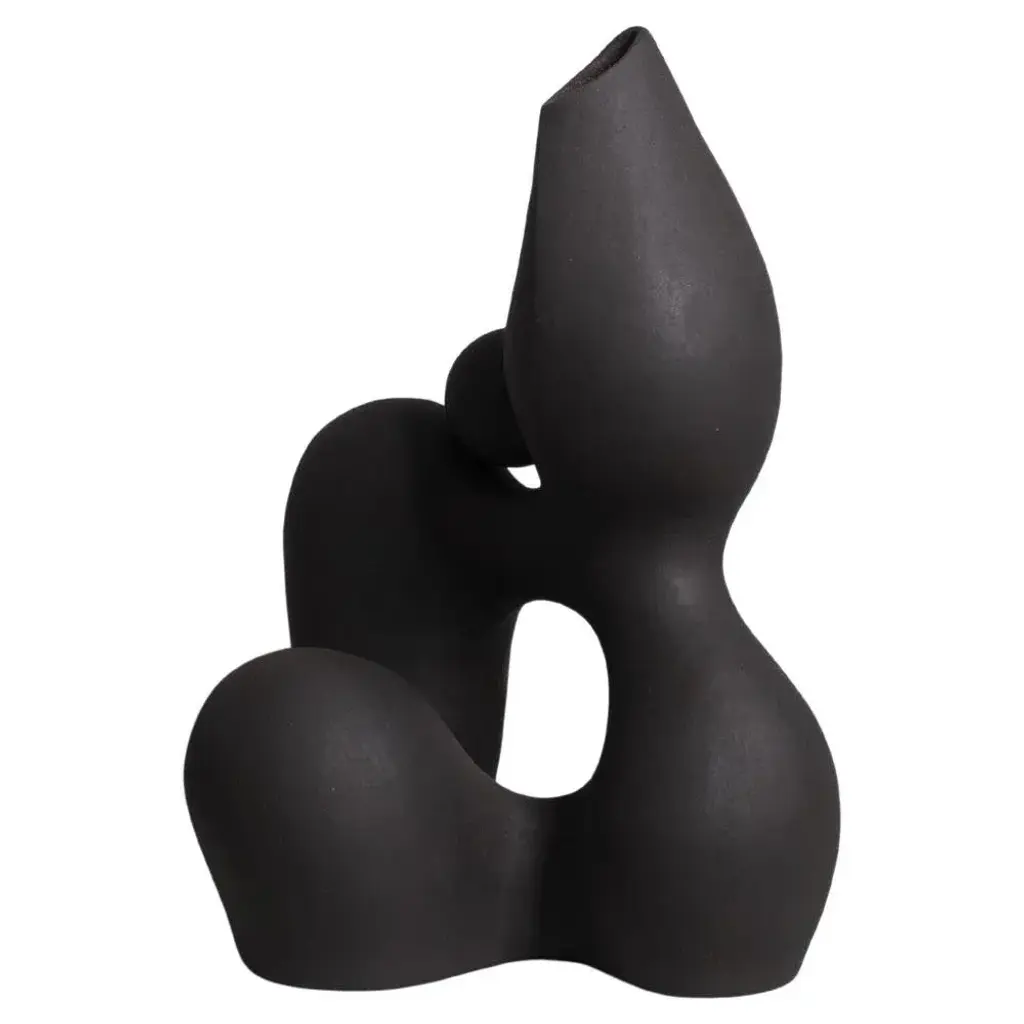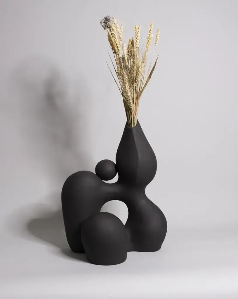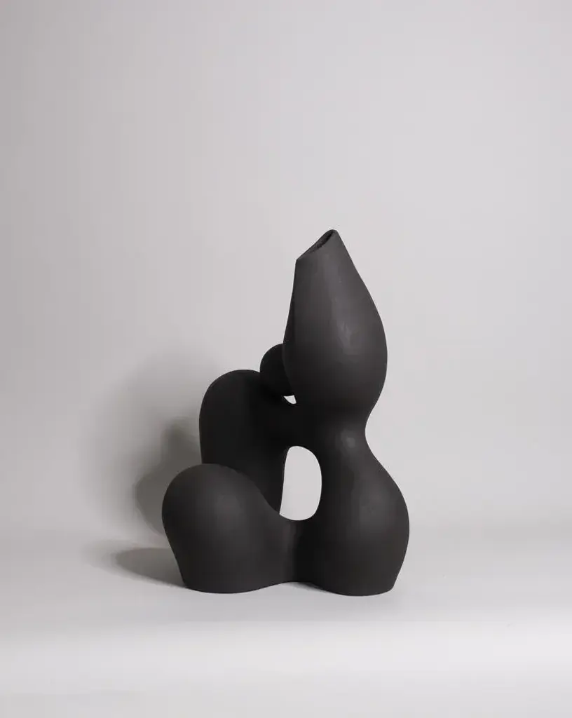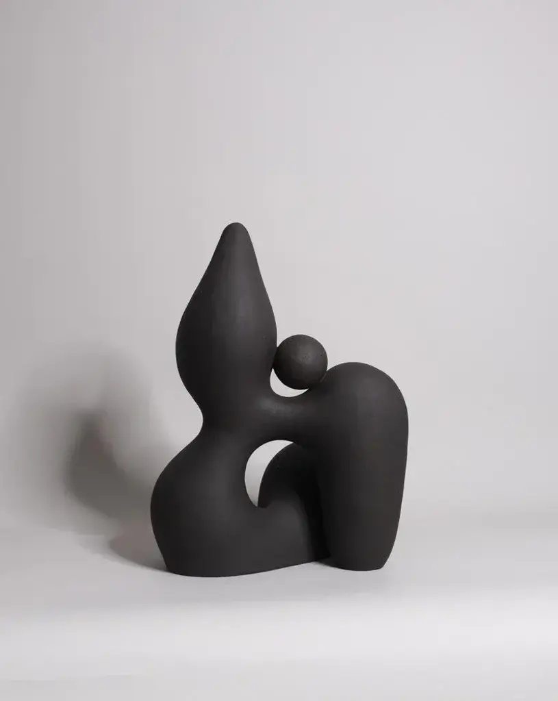 Sleeping stone ii by terre brute dimensions: 47 x 36 x 25cm materials: unglazed black stoneware. "throughout my work, i try to embrace the fluidity and organic forms found in nature. I am interested in the harmonious fusion of abstraction and biomorphism. I am also inspired by the inherent qualities of the material i work with. I aim to express movement, as if my sculptures were frozen in a moment of transformation. I like to think of them as physical souvenirs of an evolving landscape ; hills rolling under the wind, ocean waves flowing in a rhythmic pattern, rocks weathering in a riverbed. I try to capture the essence of organic forms in my sculptures. I see my work as an analogy for the unbreakable bond between human beings and the environment, embodying a sense of harmony and unity. As such my sculptures interact with their surrounding space, inviting the viewer to engage with them from different perspectives." terre brute (anastasia gladkova)