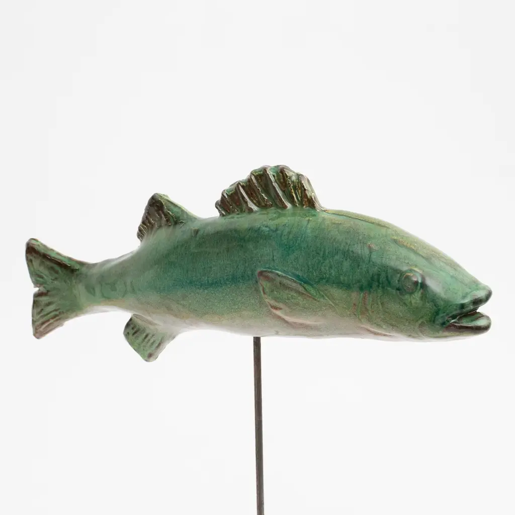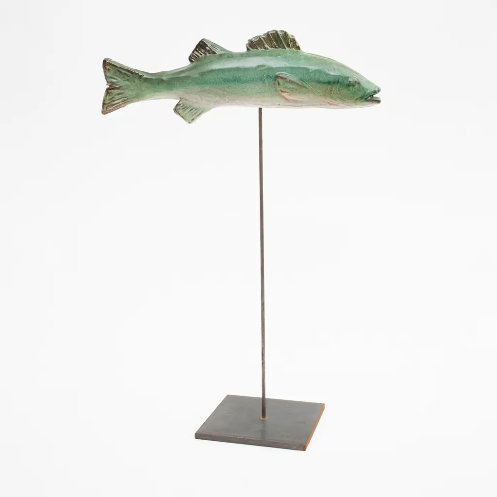 This seabass is part of the table Aquario group but is also doing very well on its own; the ceramic fish stands on an iron base whose height can be adjusted as desired. An iconic and symbolic auspicious animal, it is modeled and glazed to recreate marine chromatic effects of unique elegance. Each piece is different from the other and can be alone or part of a private seascape. Please, contact the Concierge for further information.