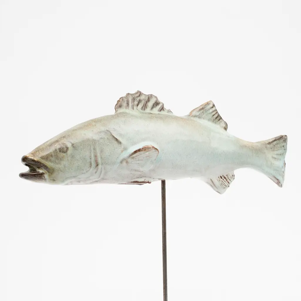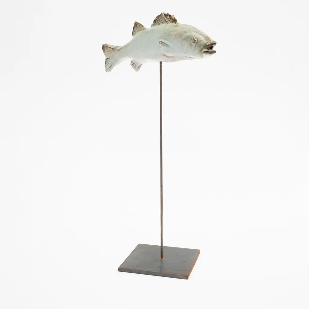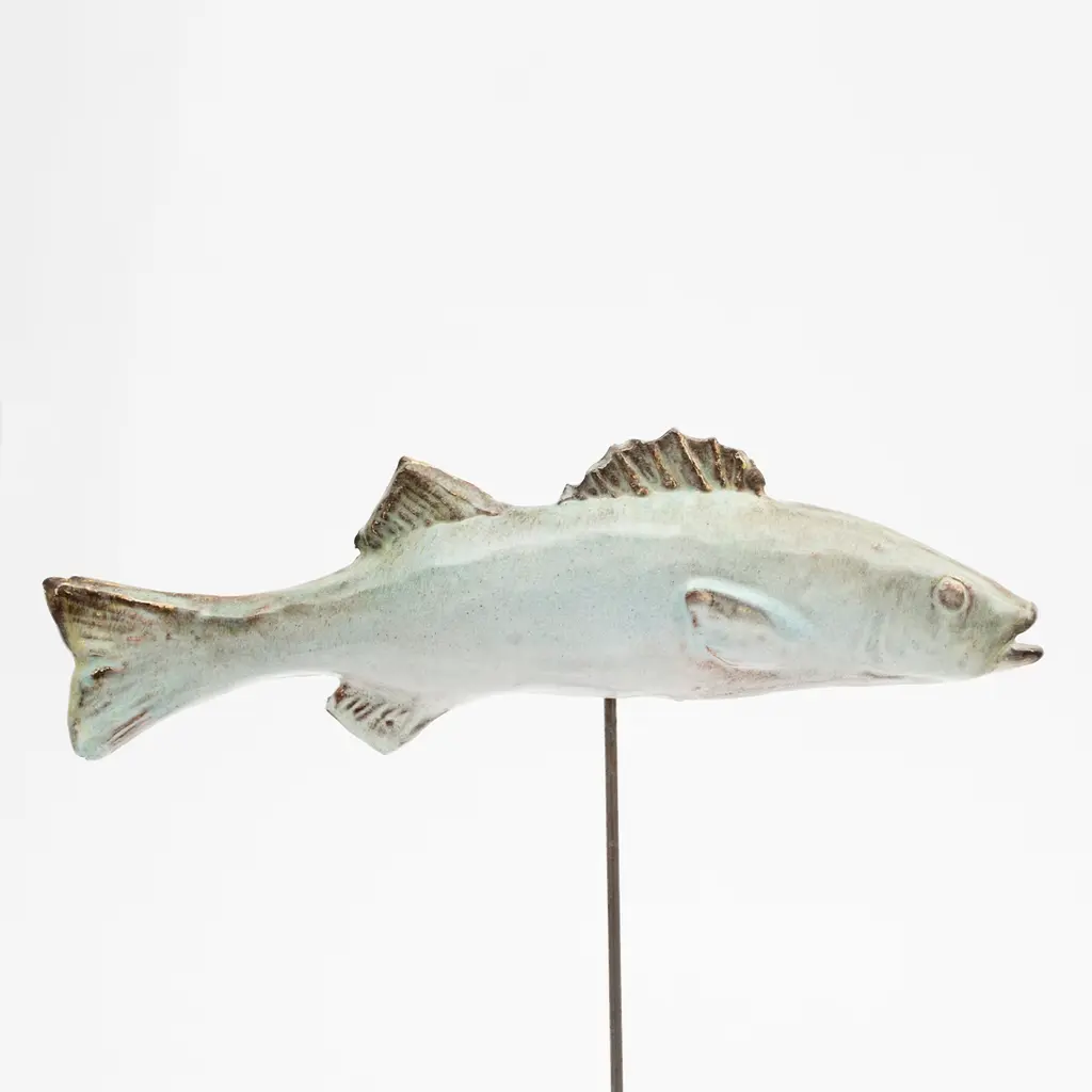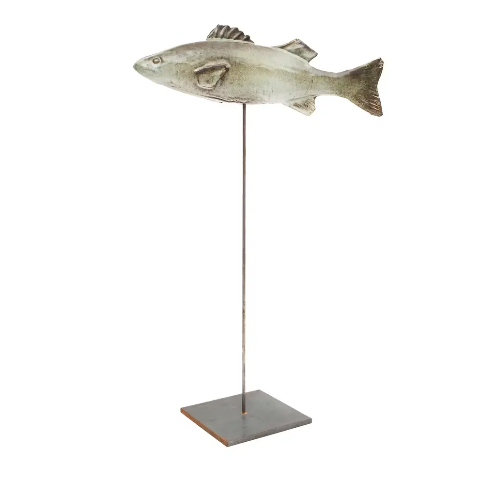 This seabass is part of the table Aquario group but is also doing very well on its own; the ceramic fish stands on an iron base whose height can be adjusted as desired. An iconic and symbolic auspicious animal, it is modeled and glazed to recreate marine chromatic effects of unique elegance. Each piece is different from the other and can be alone or part of a private seascape. Please, contact the Concierge for further information.
