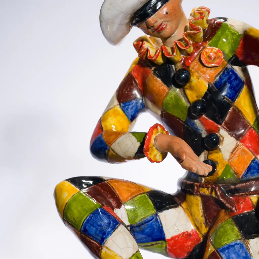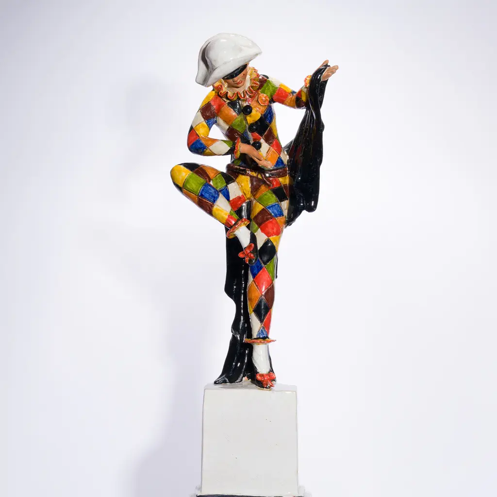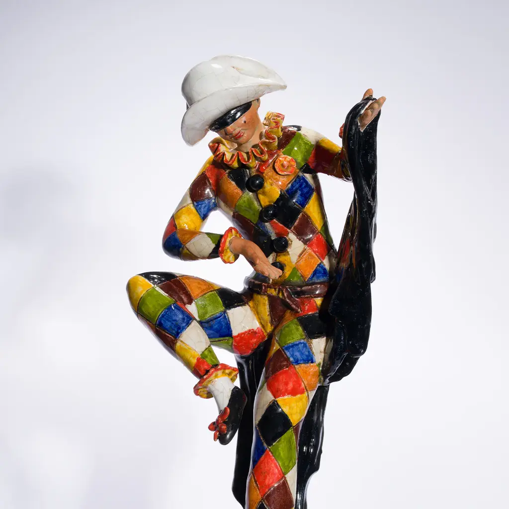 Mysterious yet alluring, this exquisite statue strikes a poetic balance between art and decor. One of the most recognizable characters from the Commedia dell'Arte, the Harlequin is here depicted performing a magic trick with his swooping black cape. Every detail is expertly rendered by hand, from the iconic, multi-colored, checkered costume and bold neck riffle to the structured white hat and slim eye mask. Showcased exclusively at Milano Design Week 2018, this piece of fine craftsmanship is a striking addition to a personal collection or given as a gift to a lover of theatre and art.