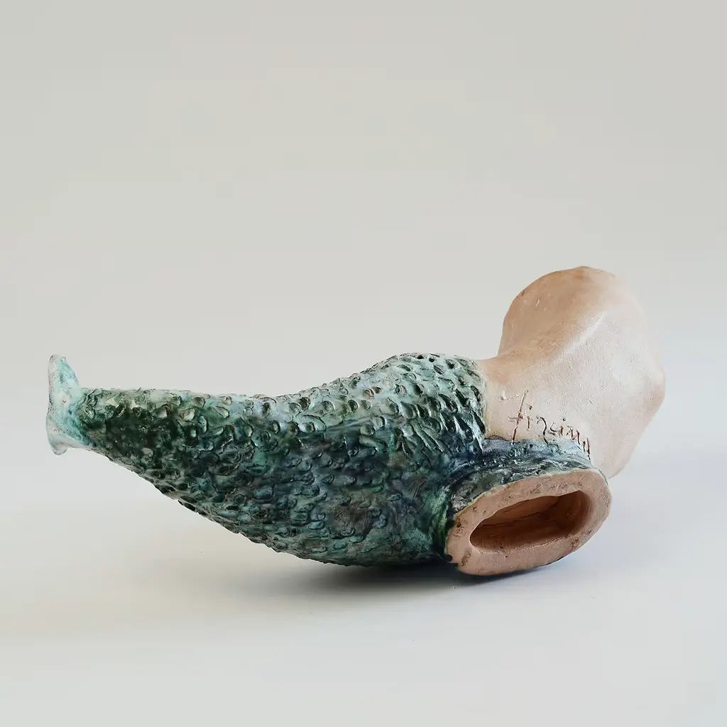 This striking sculpture bares an abstracted mermaid-like shape and was hand crafted in terracotta using the coiling technique. The piece was then covered with rich glazes and oxides in copper and green. Due to its hand-crafted nature, reproductions of this piece will be similar but not identical.