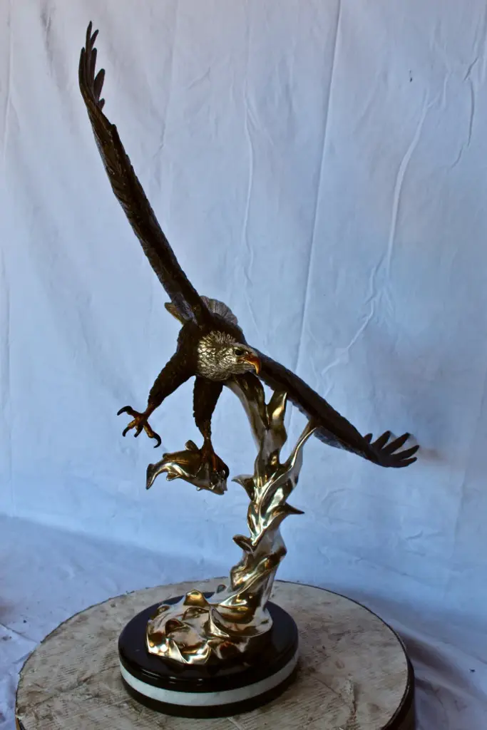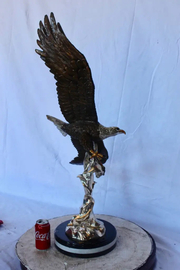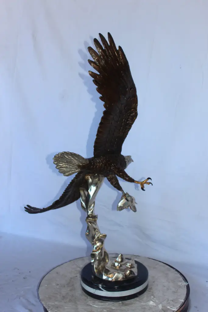 Soaring above the rest with his prey in hand, this detailed and exquisite bronze statue replicates the pride and strength an eagle carries. From the caught fish to the tail of the eagle, detail is not lacking whatsoever. The waves of the sea and the fish he caught from it are presented with a silver finish, emphasizing the scene clearly. This piece of true art would grab attention wherever placed. Size: 16"L x 23"W x 39"H. Weight is: 50Lb