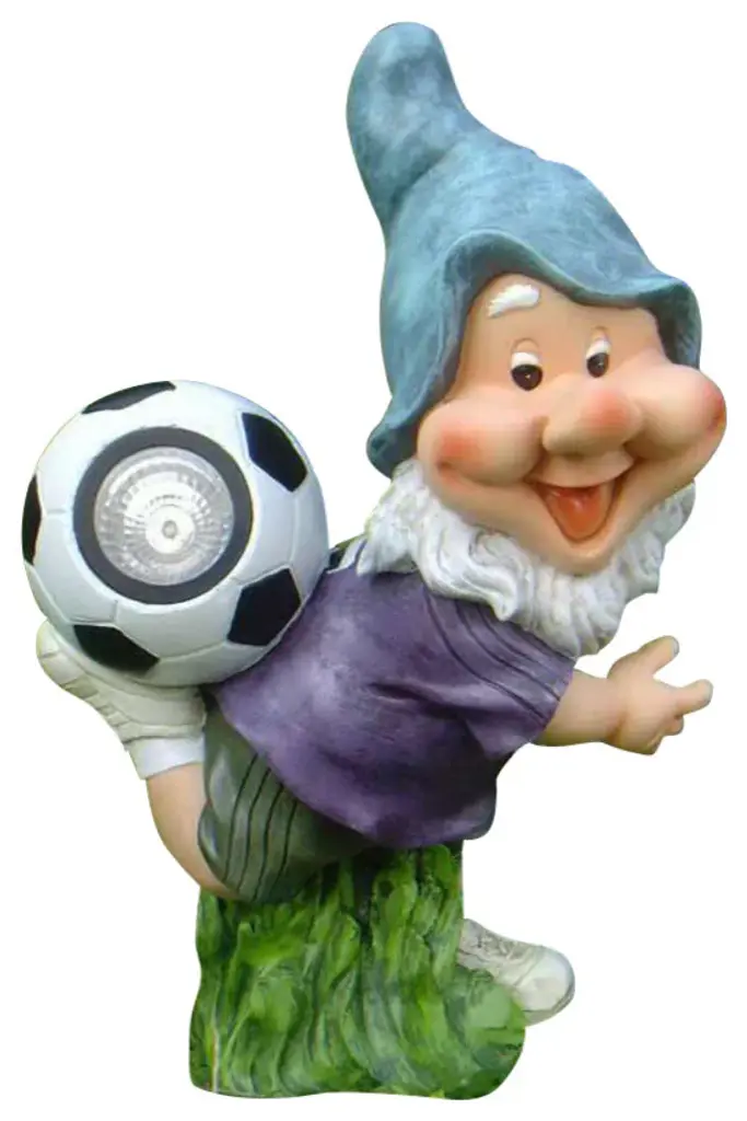 Here''s one cute gnome who''ll steal your heart! The SINTECHNO Solar Gnome Soccer Statue. Crafted of weather-resistant polyresin. Handpainted gnome soccer statue. Place indoors or outdoors.