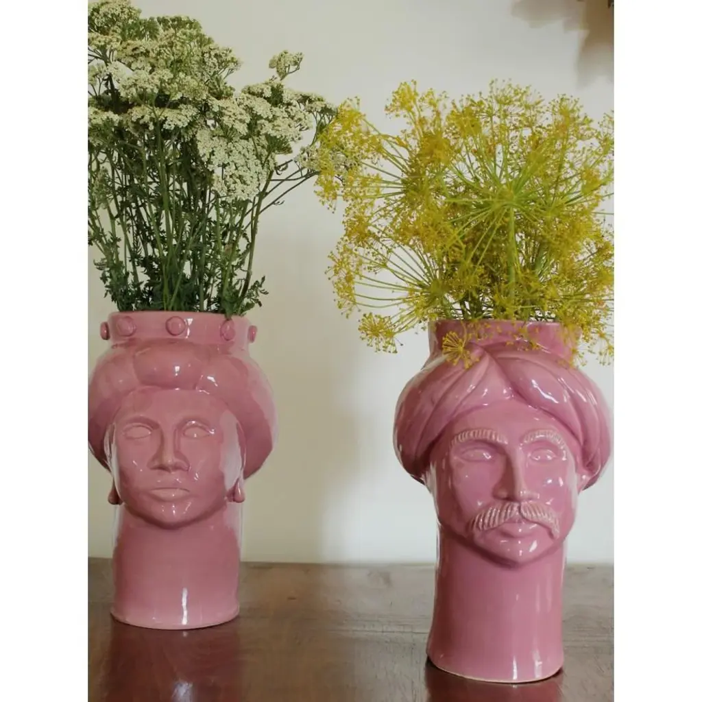 Also in this reduced version of our heads, we sought the right balance of textures and colors. Our couple, representing suleiman the magnificent, sultan of the ottoman empire, and his wife roxelana, stands out for its elegant design, purity of lines and captivating colors; always present in our creations. The voluminous turbans of suleiman and roxelana, their proud features and their symmetries, create two sculptures that communicate with each other. This pair will know how to enrich the house with its contained forms that never give up the beauty and the elegance of the shapes. Details & dimensions • material: ceramics • dimensions (in): w 9 x d 9 x h 12 • dimensions (cm): w 22 x d 22 x h 30 • handmade in italy