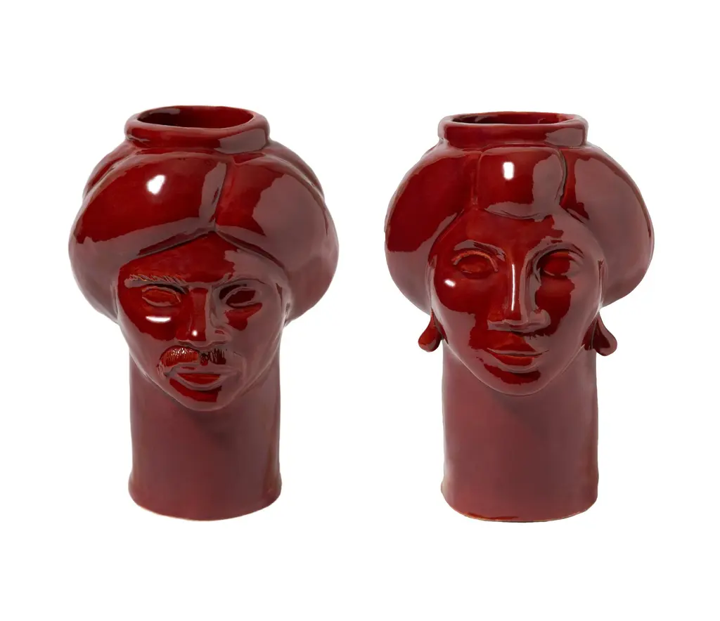 Also in this reduced version of our heads, we sought the right balance of textures and colors. Our couple, representing suleiman the magnificent, sultan of the ottoman empire, and his wife roxelana, stands out for its elegant design, purity of lines and captivating colors; always present in our creations. The voluminous turbans of suleiman and roxelana, their proud features and their symmetries, create two sculptures that communicate with each other. This pair will know how to enrich the house with its contained forms that never give up the beauty and the elegance of the shapes. Details & dimensions • material: ceramics • dimensions (in): w 7.09 x d 7.09 x h 7.87 • dimensions (cm): w 18 x d 18 x h 20 • handmade in italy