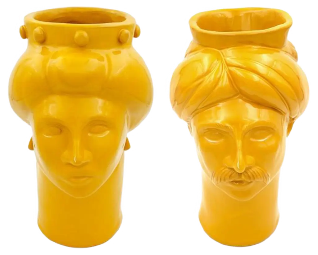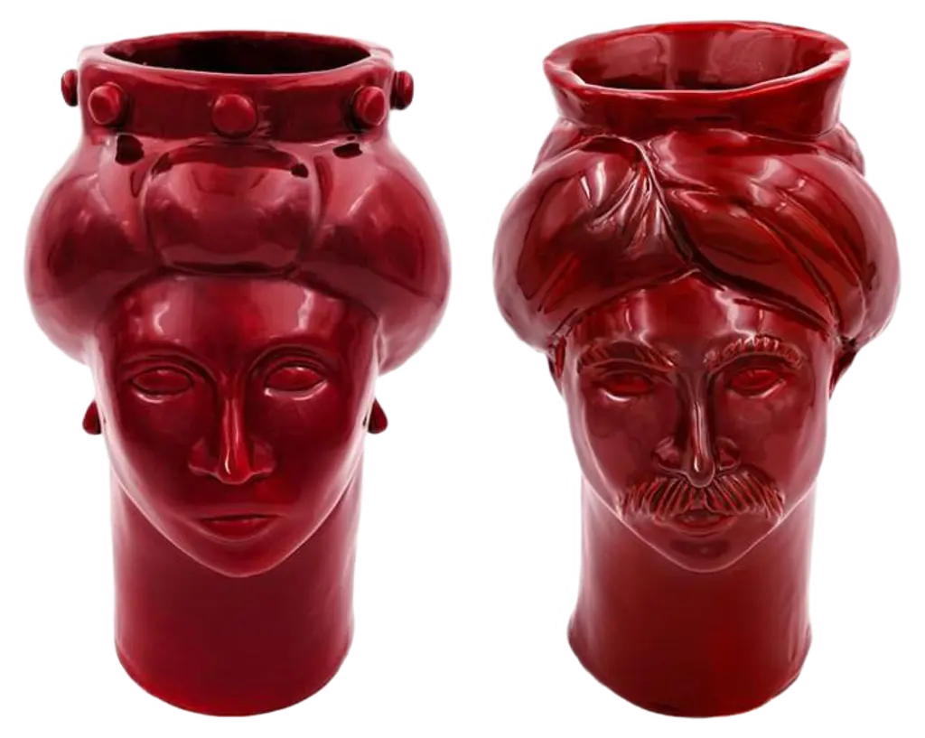 Also in this reduced version of our heads, we sought the right balance of textures and colors. Our couple, representing suleiman the magnificent, sultan of the ottoman empire, and his wife roxelana, stands out for its elegant design, purity of lines and captivating colors; always present in our creations. The voluminous turbans of suleiman and roxelana, their proud features and their symmetries, create two sculptures that communicate with each other. This pair will know how to enrich the house with its contained forms that never give up the beauty and the elegance of the shapes. Details & dimensions • material: ceramics • dimensions (in): w 9 x d 9 x h 12 • dimensions (cm): w 22 x d 22 x h 30 • handmade in italy handcrafted for you, ships in 2-3 weeks