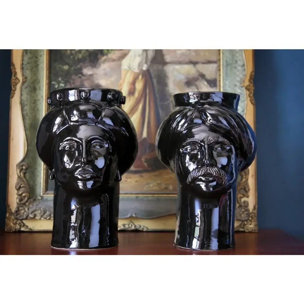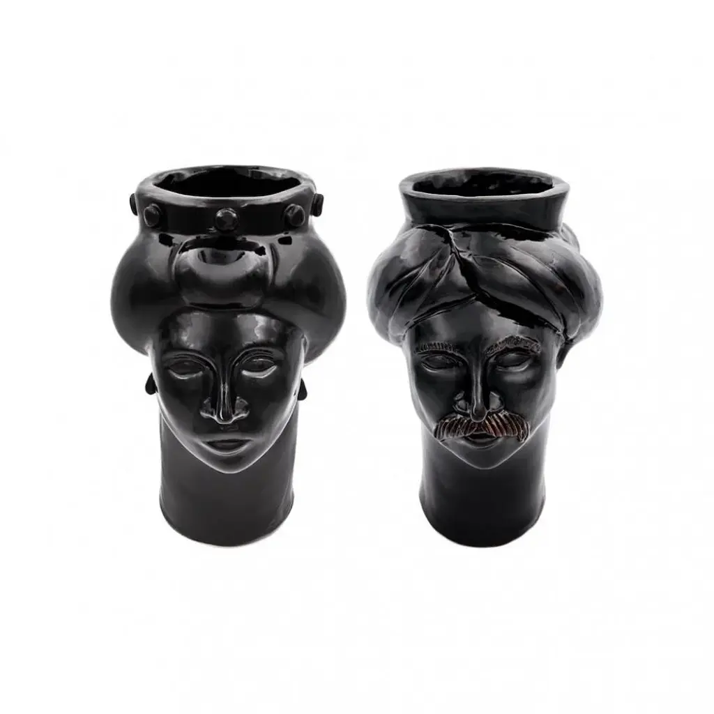 Also in this reduced version of our heads, we sought the right balance of textures and colors. Our couple, representing suleiman the magnificent, sultan of the ottoman empire, and his wife roxelana, stands out for its elegant design, purity of lines and captivating colors; always present in our creations. The voluminous turbans of suleiman and roxelana, their proud features and their symmetries, create two sculptures that communicate with each other. This pair will know how to enrich the house with its contained forms that never give up the beauty and the elegance of the shapes. Details & dimensions • material: ceramics • dimensions (in): w 9 x d 9 x h 12 • dimensions (cm): w 22 x d 22 x h 30 • handmade in italy handcrafted for you, ships in 2-3 weeks