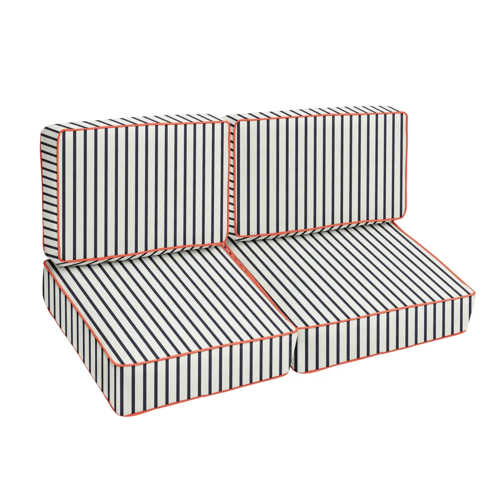 Soak up the sunshine this summer with the help of this cozy sofa pillow and cushion set! Featuring a timeless stripe fabric in a rich, blue hue, this pillow and cushion set will elevate your space and provide so much more comfort for you and your guests! Crafted out of a performance material right here in North America, this set it built to withstand sun, stains and weather so that you can enjoy relax worry-free! Sunbrella is founded on the belief that fabrics should be both beautiful and functional. We began in the 1960s with the challenge of creating an awning canvas with a substantially longer lifespan than cotton. Sunbrella has become widely adopted for shade structures, marine canvas and upholstery fabric for both outdoor and indoor applications.Our textiles are made with close attention to design detail, and engineered with robust performance characteristics that provide resistance to fading and degradation from sunlight and chemical exposure. The fabric is tactile yet durable, has industry-leading environmental characteristics, is easy to care for and offers long life wherever it''s used.No Sunbrella manufacturing facility in the world sends waste to landfills. A result of our focus on efficiency, this monumental achievement allows Sunbrella to lead by example, putting sustainability into practice every day across the globe. Our unique coloring process not only makes Sunbrella fabrics fade-resistant, it also conserves more water than conventional dyeing processes. At Sunbrella we believe it''s important to preserve the environment around our facilities. We work to conserve the plant and animal life that is native to the area and encourage our employees to plant gardens designed to provide fresh food and nourish local wildlife.We stand behind our fabrics with a guarantee that''s the best in the industry: a 5-year limited warranty for upholstery. This warranty protects the original purchaser of Sunbrella fabric. This warranty protects against Sunbrella fabric becoming unserviceable due to color or strength loss from normal usage and exposure conditions, including sunlight, mildew and atmospheric chemicals.• Ideal for casual indoor and outdoor use• Includes three (3) back pillows and three (3) seat cushions• Cushion cover can be removed for easy cleaning. Pillow cover is not removable.• Available in a variety of sizes and colors to ensure that you find the perfect match for your furniture• Pillows and cushions only. Furniture not included.• • Made in North America•