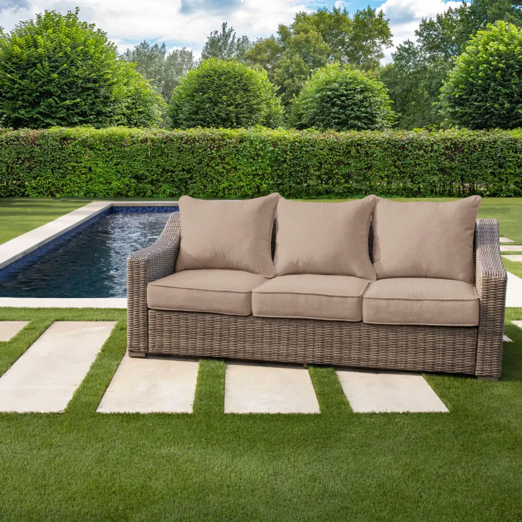 Soak up the sunshine this summer with the help of this cozy sofa pillow and cushion set! Featuring a timeless fabric, this pillow and cushion set will elevate your space and provide so much more comfort for you and your guests! Crafted out of a performance material right here in North America, this set it built to withstand sun, stains and weather so that you can enjoy relax worry-free! Sunbrella is founded on the belief that fabrics should be both beautiful and functional. We began in the 1960s with the challenge of creating an awning canvas with a substantially longer lifespan than cotton. Sunbrella has become widely adopted for shade structures, marine canvas and upholstery fabric for both outdoor and indoor applications.Our textiles are made with close attention to design detail, and engineered with robust performance characteristics that provide resistance to fading and degradation from sunlight and chemical exposure. The fabric is tactile yet durable, has industry-leading environmental characteristics, is easy to care for and offers long life wherever it''s used.No Sunbrella manufacturing facility in the world sends waste to landfills. A result of our focus on efficiency, this monumental achievement allows Sunbrella to lead by example, putting sustainability into practice every day across the globe. Our unique coloring process not only makes Sunbrella fabrics fade-resistant, it also conserves more water than conventional dyeing processes. At Sunbrella we believe it''s important to preserve the environment around our facilities. We work to conserve the plant and animal life that is native to the area and encourage our employees to plant gardens designed to provide fresh food and nourish local wildlife.We stand behind our fabrics with a guarantee that''s the best in the industry: a 5-year limited warranty for upholstery. This warranty protects the original purchaser of Sunbrella fabric. This warranty protects against Sunbrella fabric becoming unserviceable due to color or strength loss from normal usage and exposure conditions, including sunlight, mildew and atmospheric chemicals.• Ideal for casual indoor and outdoor use• Includes three (3) back pillows and three (3) seat cushions• Cushion cover can be removed for easy cleaning. Pillow cover is not removable.• Available in a variety of sizes and colors to ensure that you find the perfect match for your furniture• Pillows and cushions only. Furniture not included.• • Made in North America•