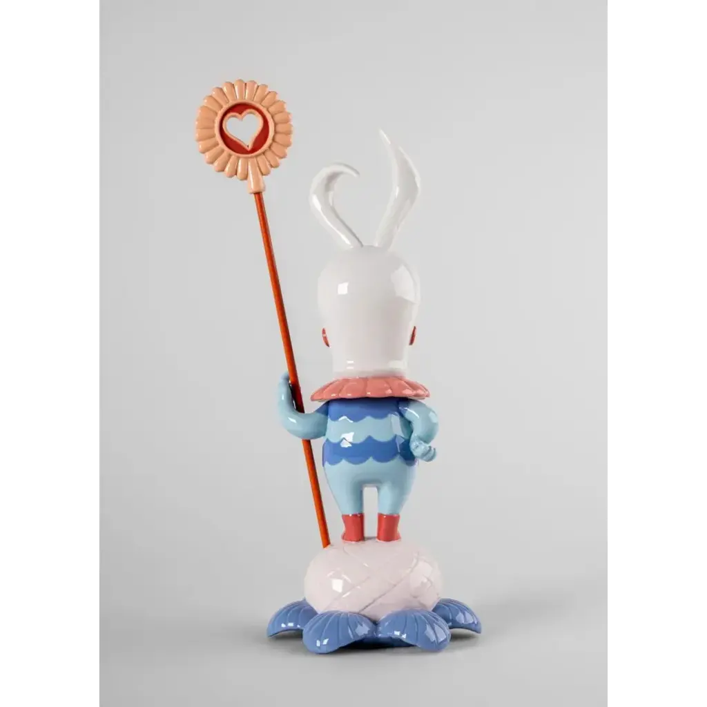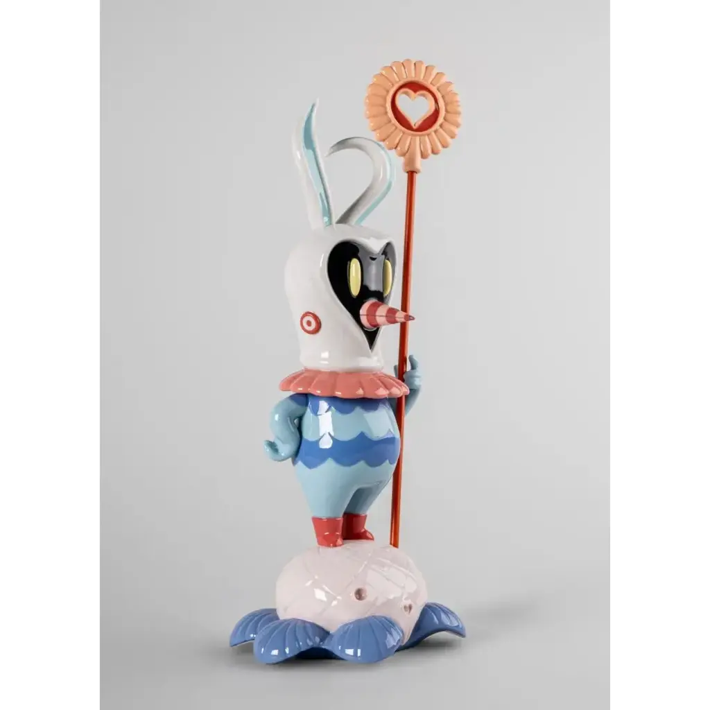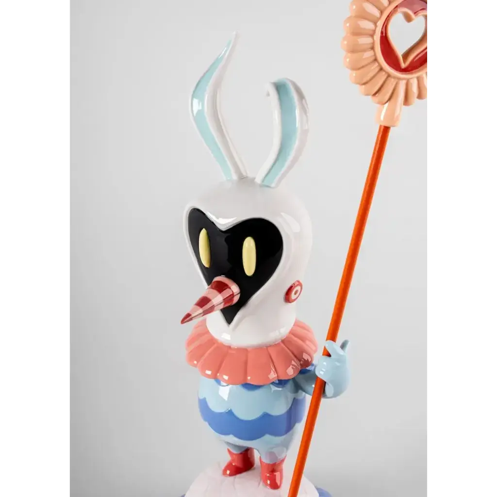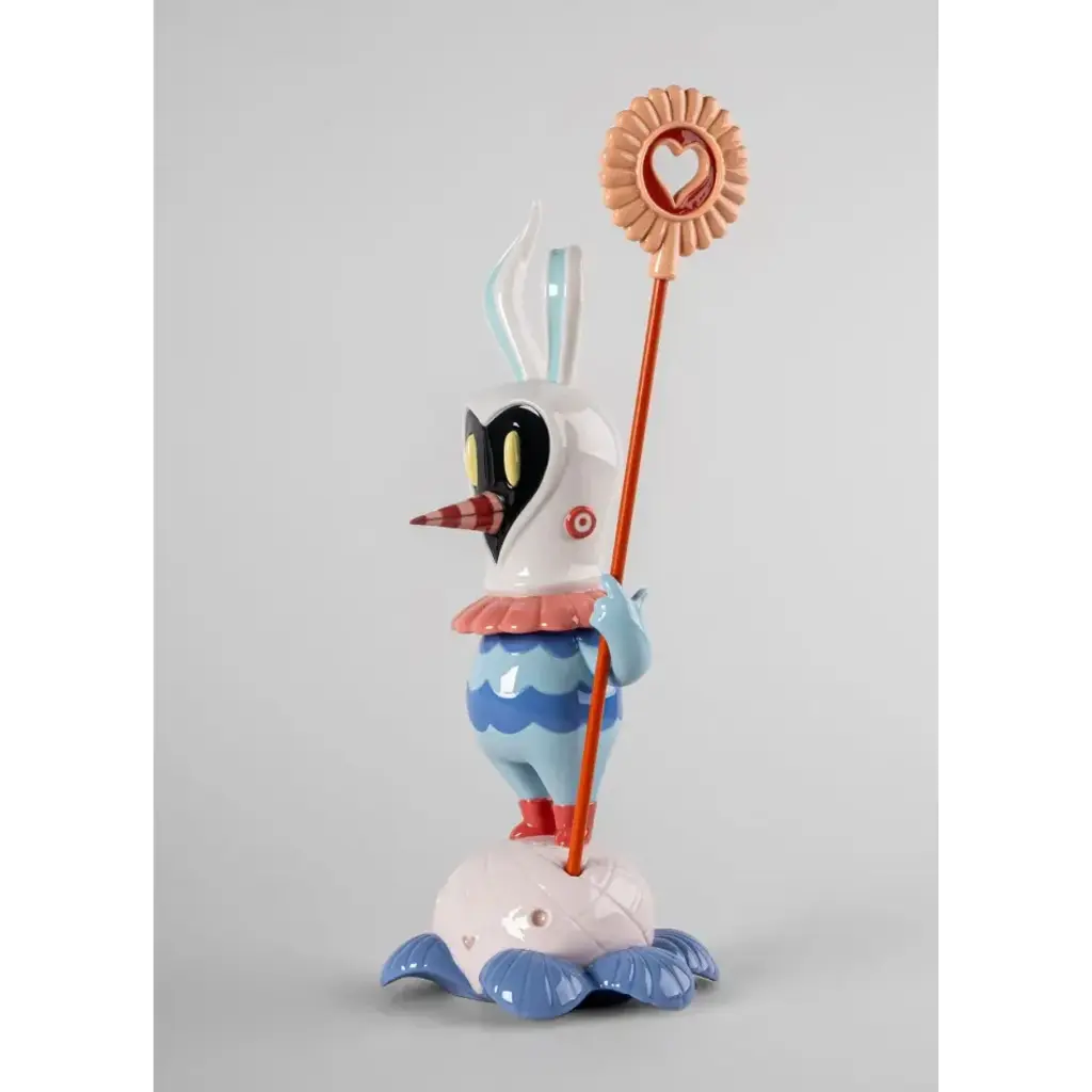 Soul Rider is a protector of nature and guide for souls in danger. This porcelain creation marks the first time the character is depicted as an independent sculpture, moving from a symbolic guardian in Dulk's murals to a tangible presence in our daily lives. Soul Rider stands on a 'flower-skull', a symbol of the danger that nature faces - while his face and his banner are in the shape of a heart, synonymous with love as an antidote to fear. This protective guardian is worked down to the smallest detail: the engraving of the flower, the clothing, the face with the bulging eyes and the ornate beak. Soft colors have been chosen for the decoration, with blues and creams predominating. Soul Rider can also be seen as a symbol of hope and redemption. In this piece, Dulk uses the minute details in the porcelain to highlight the delicacy of this relationship between man and nature, with Soul Rider acting as a bridge between the two worlds An iconic Spanish brand, Lladro is a world leader in the creation of porcelain art. Started by brothers Juan, Jose and Vicente Lladro in 1953, the ceramic figurines were initially inspired by the works of great European manufacturers like Meissen and Sevres. Over time, a unique style was forged, consisting of elongated lines, a revolutionary single-firing method, and soft pastel tones.
