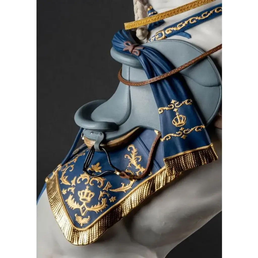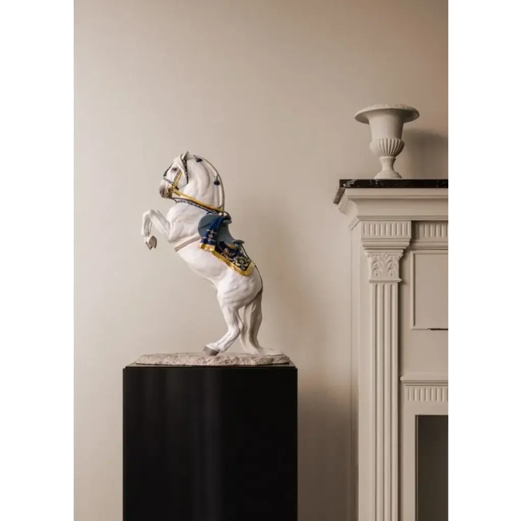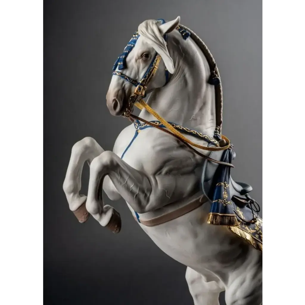 Limited edition High Porcelain sculpture of a Spanish pure breed horse carrying out a dressage exercise. An iconic Spanish brand, Lladro is a world leader in the creation of porcelain art. Started by brothers Juan, Jose and Vicente Lladro in 1953, the ceramic figurines were initially inspired by the works of great European manufacturers like Meissen and Sevres. Over time, a unique style was forged, consisting of elongated lines, a revolutionary single-firing method, and soft pastel tones.