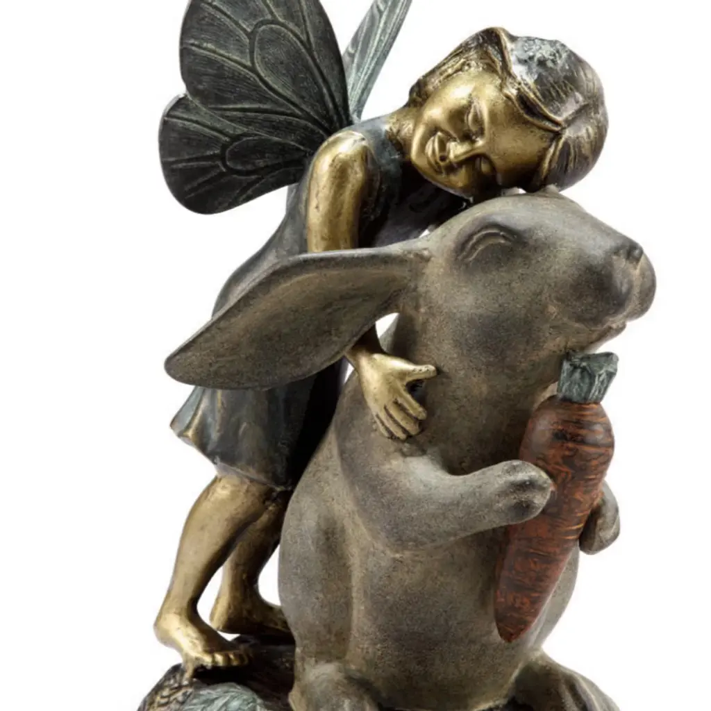 Happiness Garden Sculpture with Fairy and Rabbit for Whimsical Outdoor Decor Invite a sense of wonder and gentle joy into your outdoor sanctuary with the Happiness Garden Sculpture featuring a fairy and rabbit. This enchanting piece captures a magical moment of friendship, perfect for adding a touch of fantasy and heartwarming charm to your garden or patio. Key Features You'll Adore: Whimsical Storybook Design: Depicts a sweet fairy and her rabbit companion in a serene, joyful pose. Durable Aluminum Construction: Built to last with strength and stability for outdoor display. Weather-Resistant Finish: Rust-free and fade-resistant to maintain its magic year-round. Versatile Placement: Ideal for gardens, flower beds, porches, or indoor nooks with a whimsical theme. Artisanal Hand-Finished Detail: Features delicate textures and soft patina for added character. Perfect Gift for Dreamers: A heartwarming present for fairy lovers and garden décor fans. Dimensions: Approximately 14" H x 10" W x 8" D. Celebrate gentle magic and joyful companionship with the Happiness Garden Sculpture where imagination blooms and whimsy finds a home.