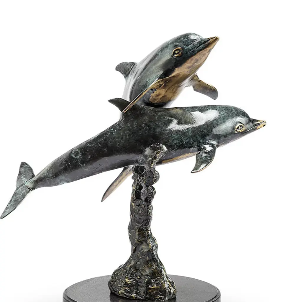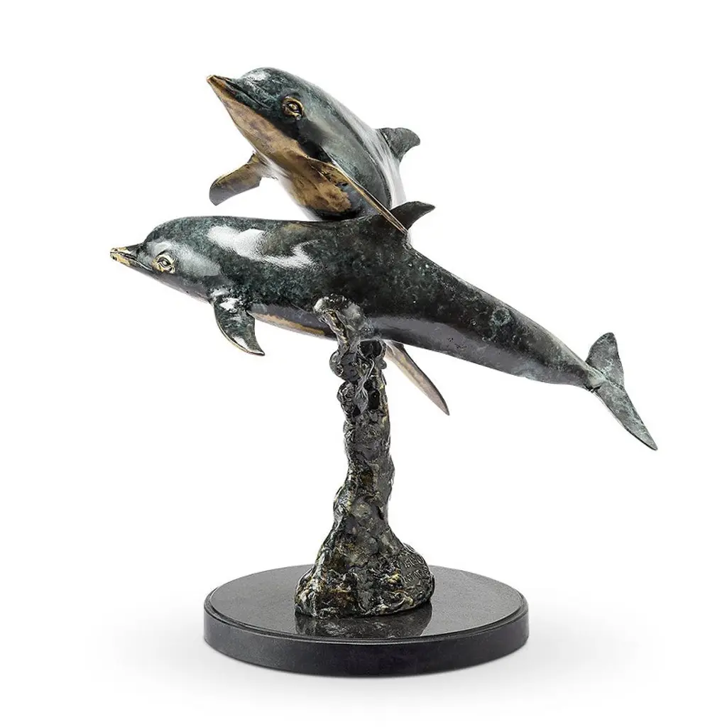 Celebrate the beauty of marine life with the SPI Home Playful Dolphin Pair Sculpture, a coastal-inspired piece expertly crafted from solid brass. Featuring two dolphins in mid-leap over swirling waves, this intricately detailed sculpture evokes motion and joy. The dynamic pose and lustrous brass finish create a captivating focal point, ideal for coastal homes, beach-inspired interiors, or nautical collectors. Measuring 15 inches high by 12.5 inches wide and 11.5 inches deep, it fits perfectly on a mantel, entry table, or bookshelf. Its freestanding design makes it easy to display anywhere you want a splash of ocean energy. Key Benefits Striking Decorative Accent: Instantly elevates ocean-themed spaces with energy and movement Durable Brass Craftsmanship: Built from solid brass for weight, longevity, and timeless appeal Versatile Display Options: Perfect for living rooms, coastal offices, or entryways Compact Yet Bold: 15 × 12.5 × 11.5 inch size allows display without overwhelming your space Sculptural Artistry: Showcases dynamic dolphin motion—ideal for collectors or sea lovers