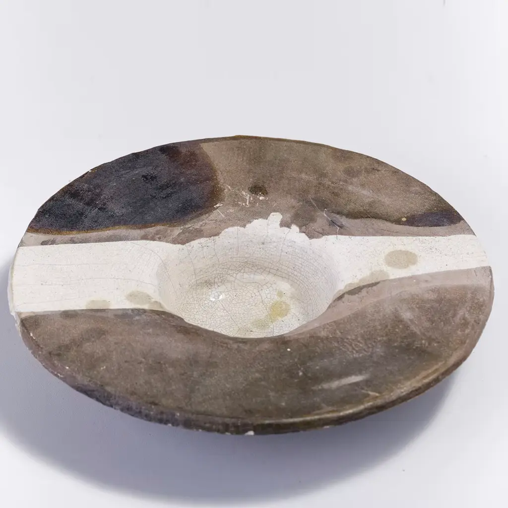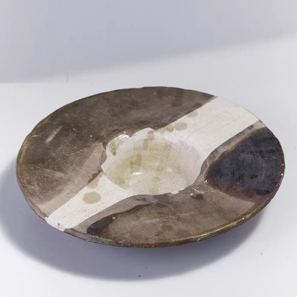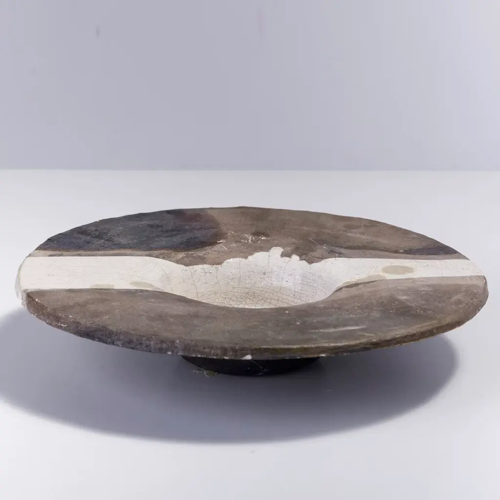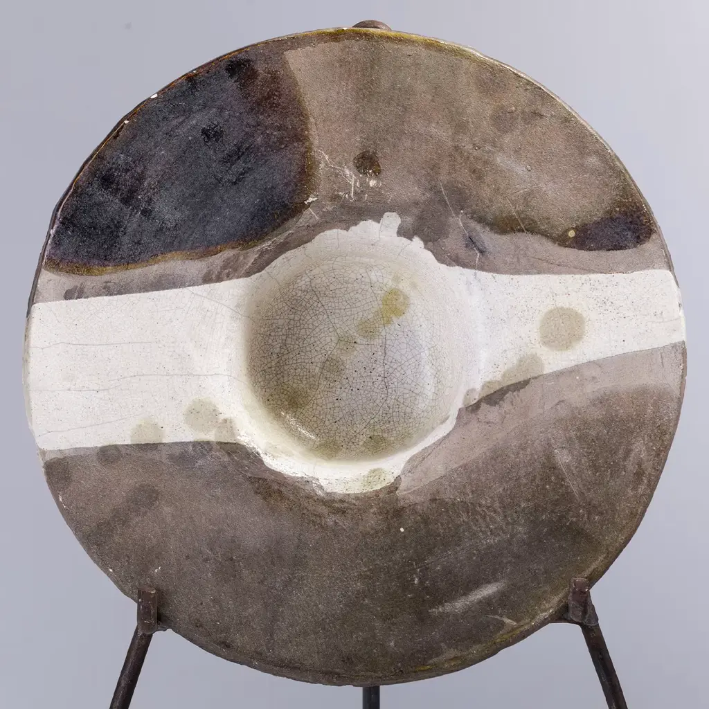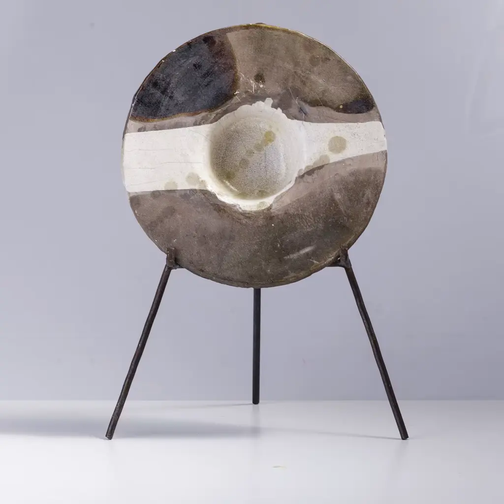 A one-off sculpture of extraordinary character, this design celebrates the naked raku ceramics technique, highlighted with the stupendous smokey shaded effect embellishing the light surface of this finely crafted object. Supported with an iron tripod, this disk-shaped sculpture will create an impressive focal point in any style of decor.