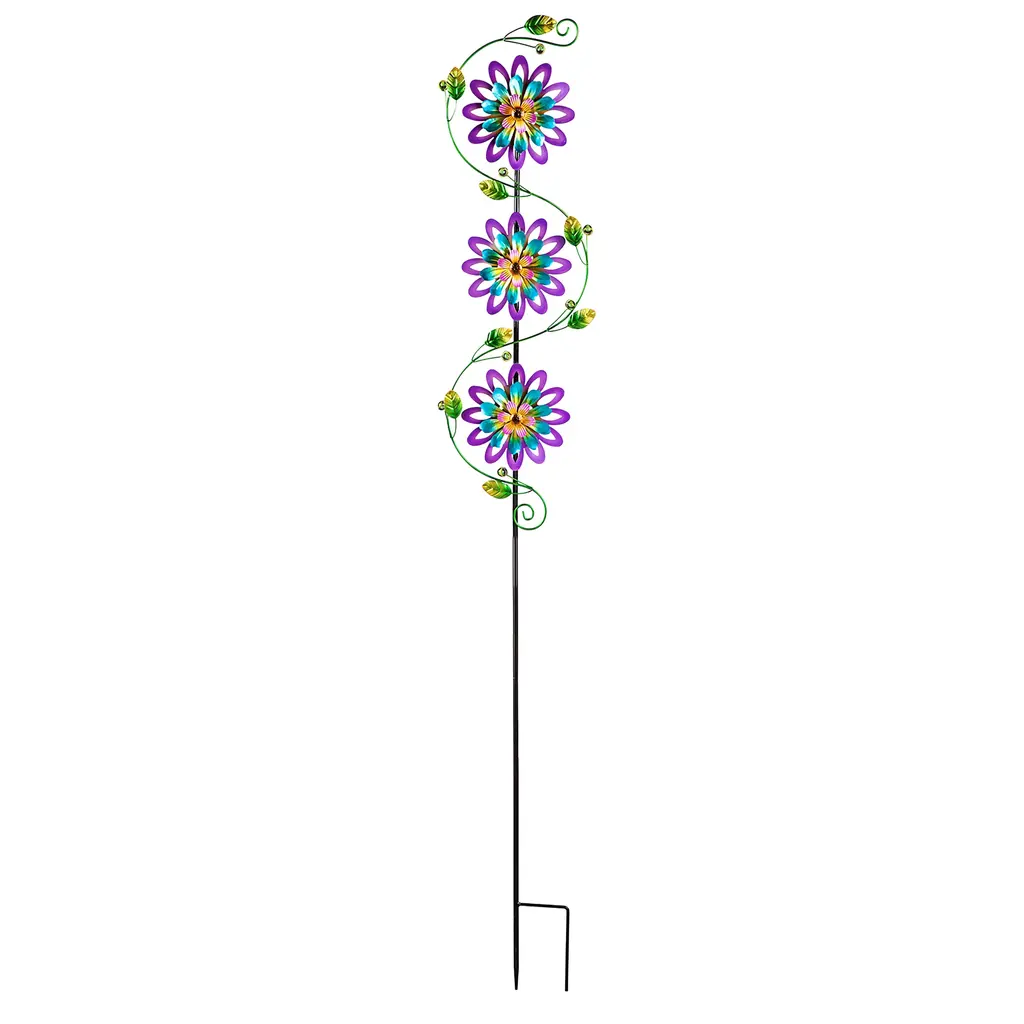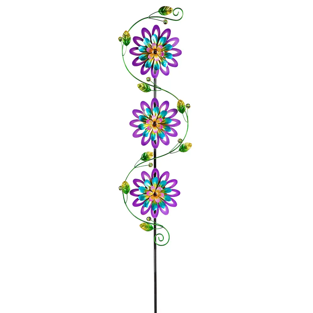 Inspire smiles and add dimensional movement to your outdoor space with this Spinning Violets Garden Stake. Three flower spinners are stacked on one another, intertwined by a delightfully intricate leafy vine. Harness the power of the wind to turn each of the violet flower wind spinners.Vibrant hues of purple, blue and yellow become a whirling blur as the metal petals catch the wind. Kinetic sculpture is built from powder-coated metal with a weather and rust-resistant finish to prevent fading. Once the stake is put together, installing the kinetic is easiest in moist soil or grass. Push the bottom prongs into the soil until they are completely covered - no tools are necessary.