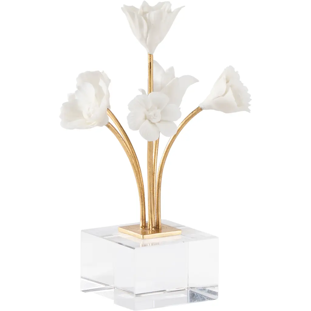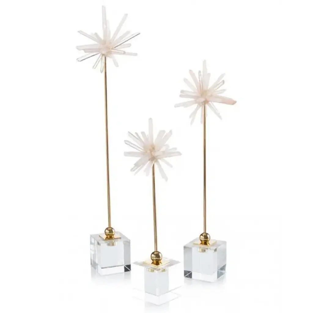 A set of three natural quartz crystal sprites are mounted on various size brass rods and mounted in a lead free crystal cube.