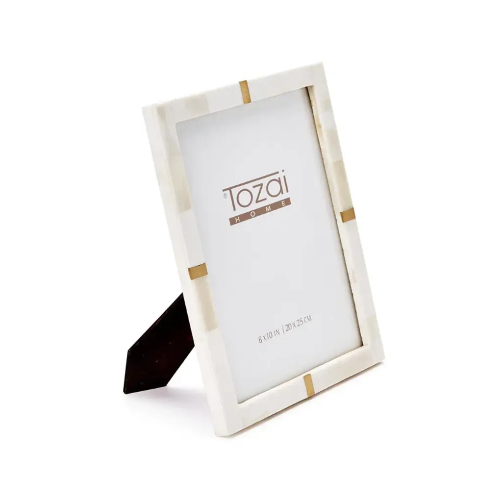 So modern but so chic. This frame is beautifully made with 100% bone. Each bone pc is hand cut and placed symmetrically to create a sculptured graphic look. With the added accents of blue these will be a welcome addition to many decors.