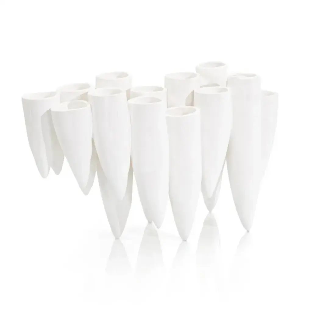 Enhance your interior space with this sculpture inspired by natural rock formations. The Stalactite Cluster Sculpture is crafted from pure porcelain in a white finish and showcases a large collection of pointed stones, introducing an alluring artistic element to an interior décor.