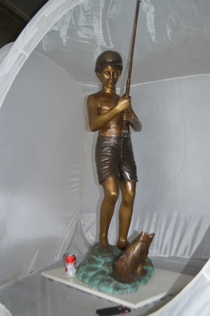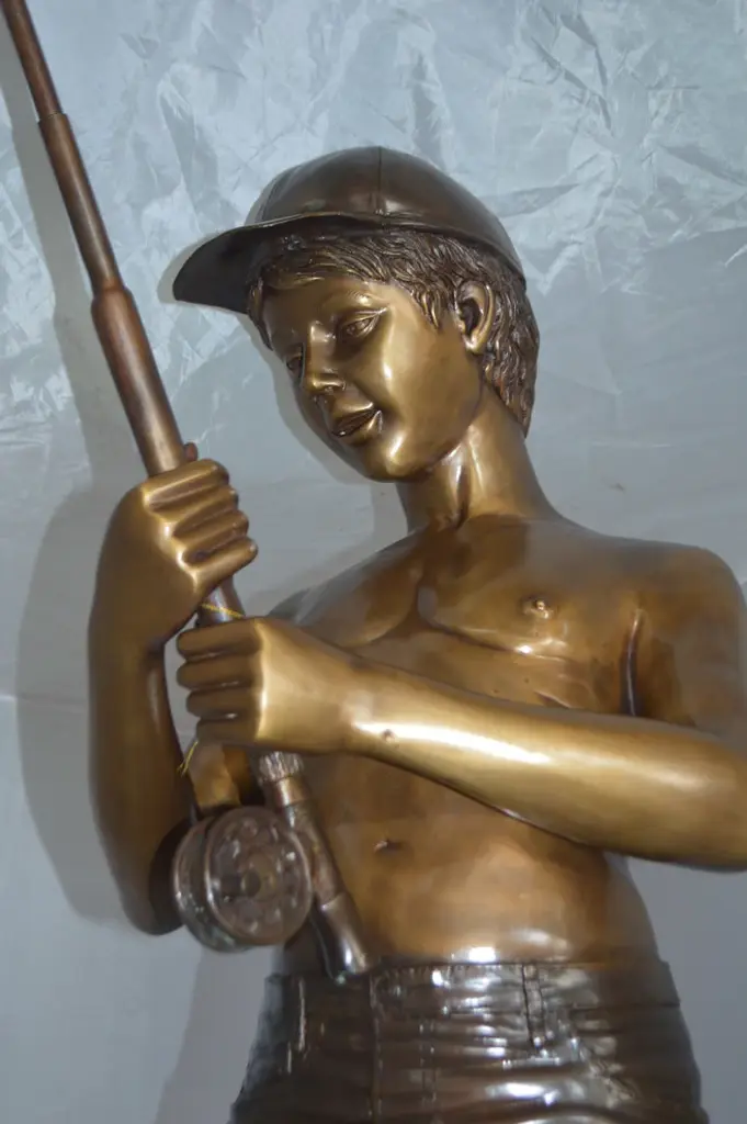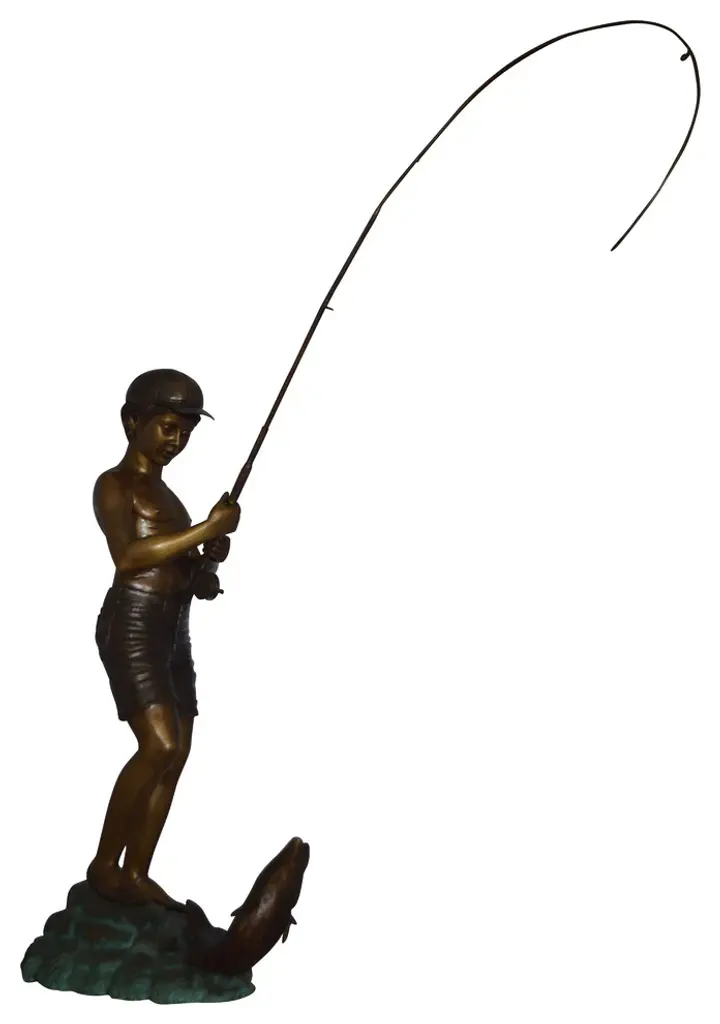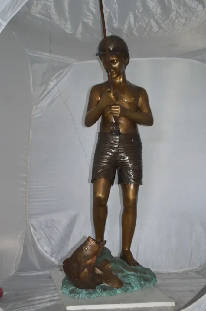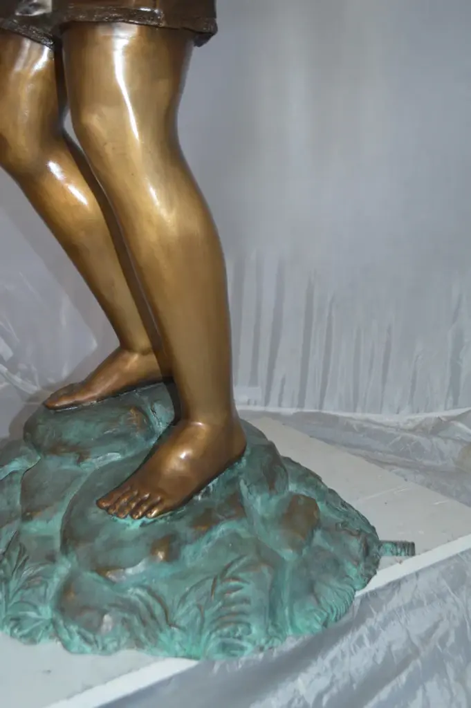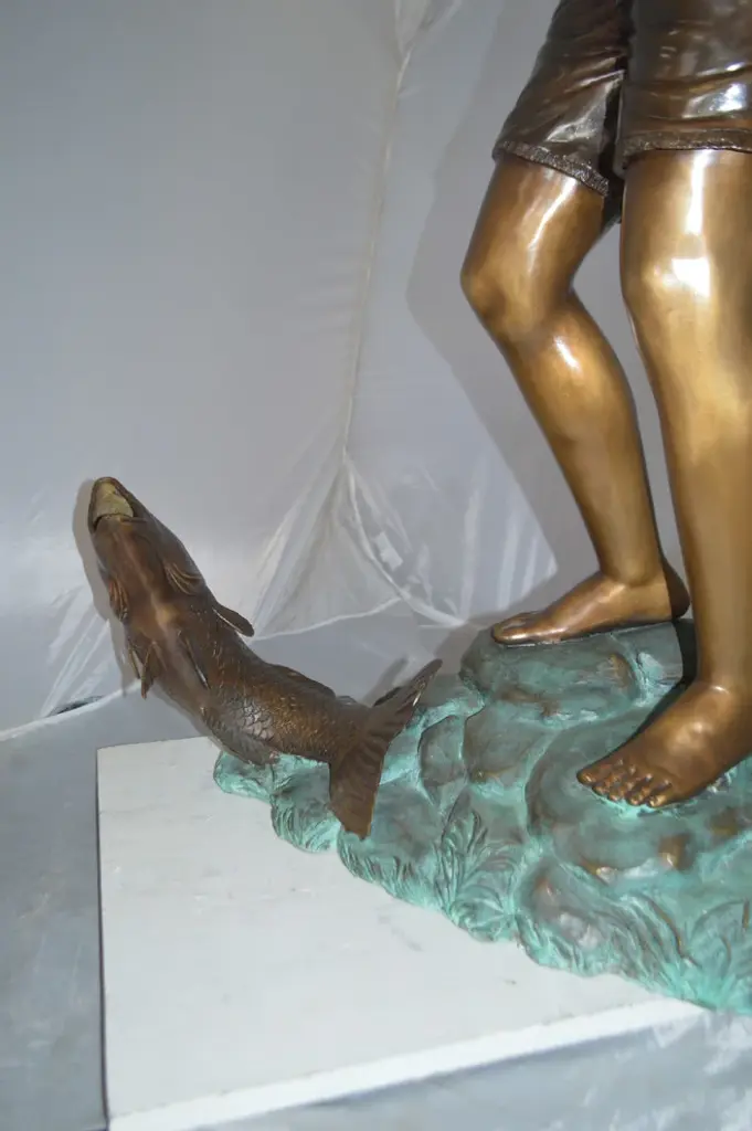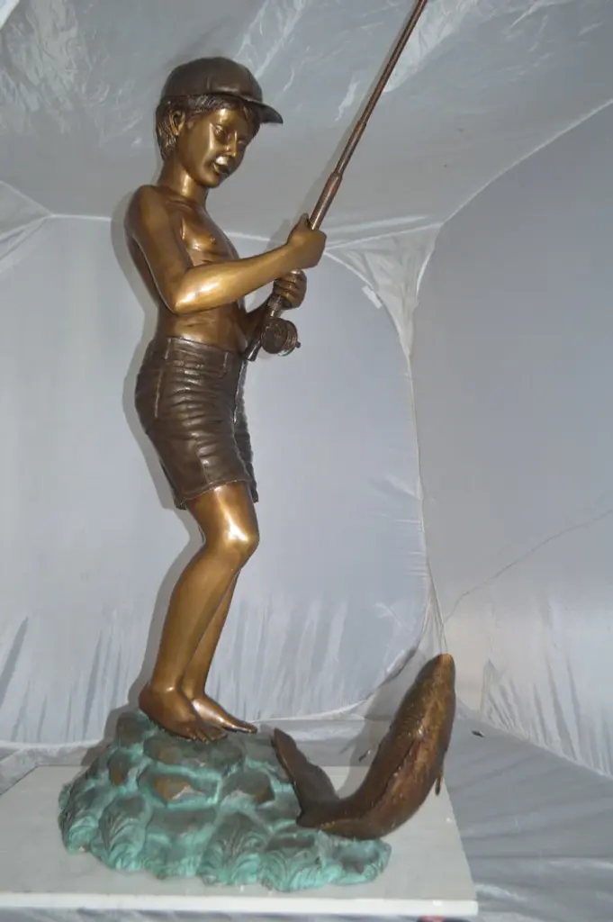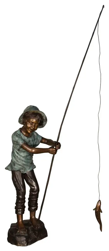 Standing Boy Fishing Fountain Bronze Statue - Size: 58"l X 25"w X 72"h.