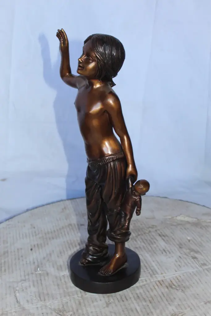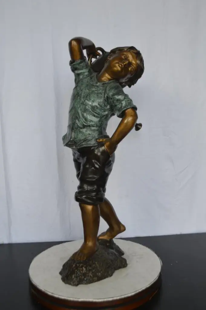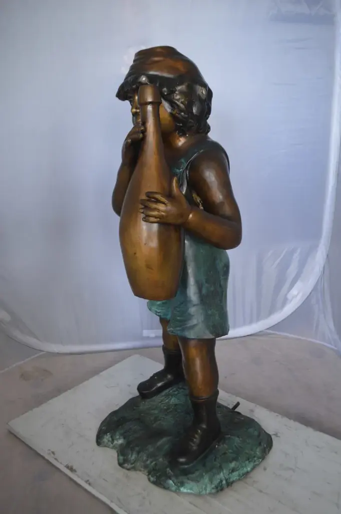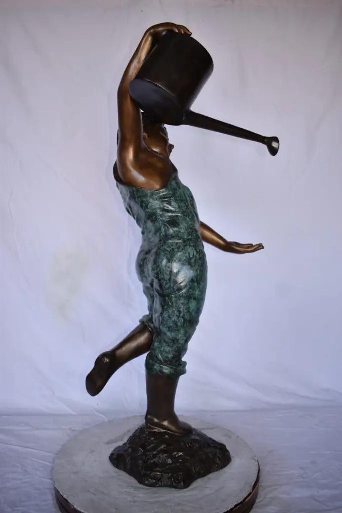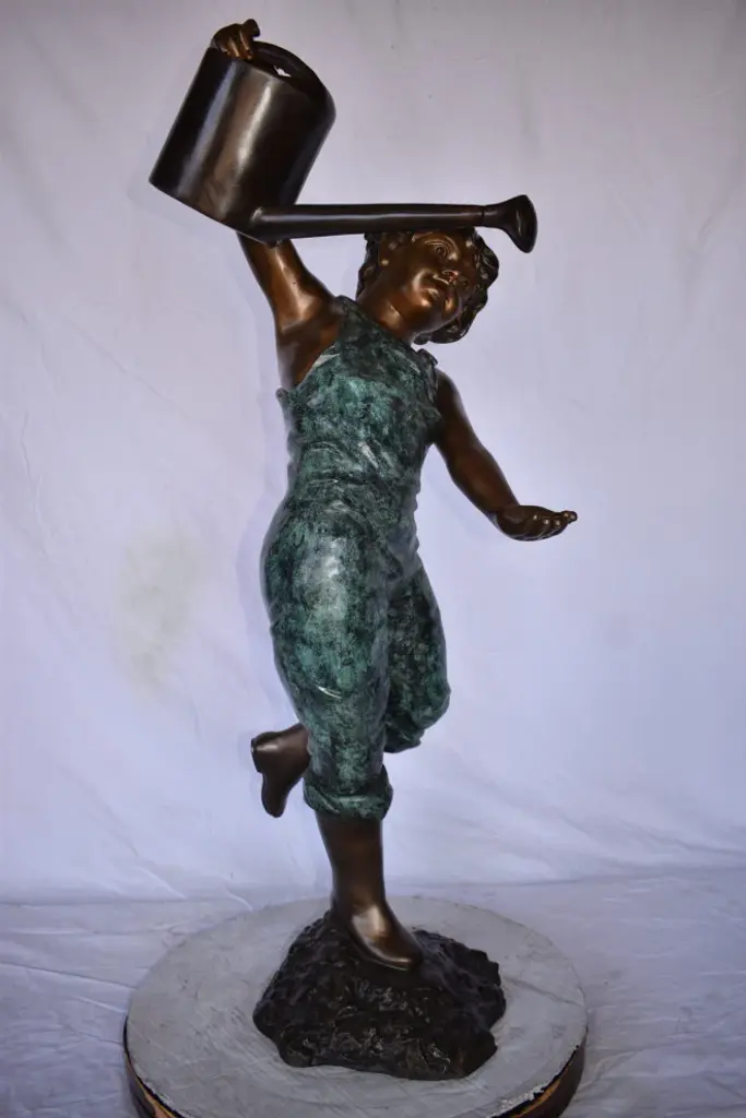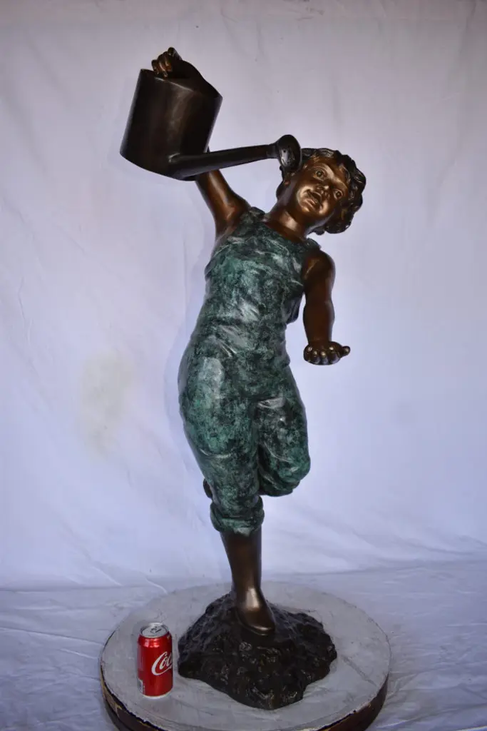 Magnificent young boy bronze sculpture. Fountain, holding a watering can over his head. Water spills from the watering can with the use of a fountain pump (pump not included). This sculpture is a finely crafted, highly detailed work of art. This impressive Bronze Statue will be a permanent fixture on the grounds of your estate for years to come. Size: 24"L x 22"W x 48"H. Weight is: 69Lb