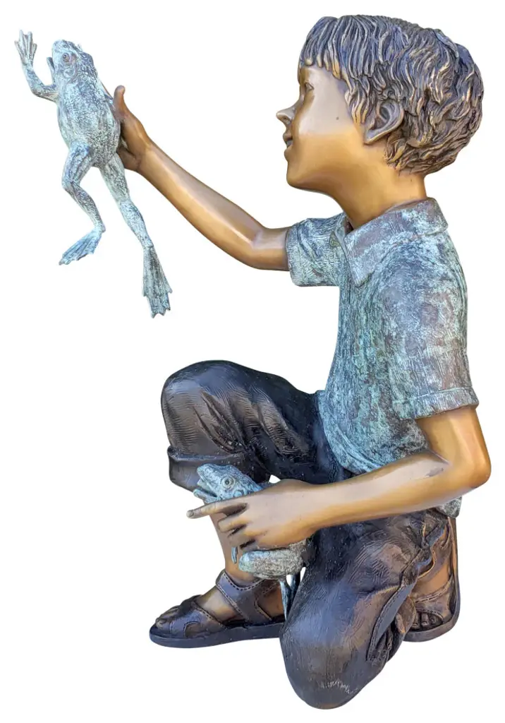 Magnificent young boy bronze sculpture of a boy, holding a watering can. This sculpture is a meticulously crafted, highly detailed work of art, made through the process of lost wax with a finish of green and brown patina. This impressive Bronze Statue will be a permanent fixture on the grounds of your estate for years to come. Size: 15"L x 15"W x 39"H. Weight is: 60Lb