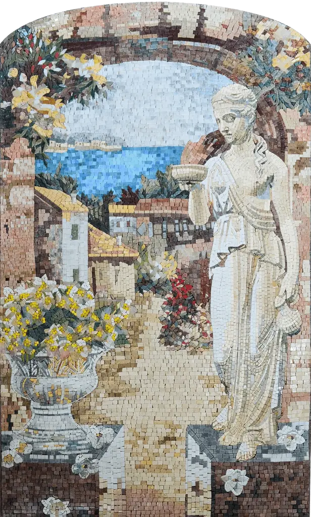 Introducing the stunning "Statue at the Village Entrance Marble Mosaic Mural," a breathtaking piece of art that brings elegance and sophistication to any space. This exquisite mural is handcrafted from 100% natural stones and art tiles, showcasing the exceptional skill and artistry involved in its creation. The focal point of the mural features a beautifully detailed statue of a woman, gracefully positioned as she gazes towards a vibrant floral arrangement at the entrance of a charming village. This enchanting piece captures the serene essence of village life, making it an ideal addition to both indoor and outdoor settings. Whether you choose to display it in your living room, garden, or patio, this mosaic mural is certain to be a captivating conversation starter, drawing the gaze of all who encounter it. Each mural is fully handmade, allowing for a unique touch that mass-produced items simply can't replicate. Furthermore, the "Statue at the Village Entrance" mural can be customized to suit your individual preferences, offering options for various sizes and a wide array of colors. This means you can create a personalized piece that fits perfectly in your home, harmonizing with your existing decor while adding an elegant focal point.Embrace the beauty of artisanal craftsmanship with this marble mosaic mural, and transform your space into a sanctuary of artistry and grace. Make a statement with your decor and celebrate the allure of handmade art with the "Statue at the Village Entrance Marble Mosaic Mural." Perfect for those who appreciate beauty, individuality, and the timeless charm of mosaic art, this mural is a treasure you won’t want to miss.