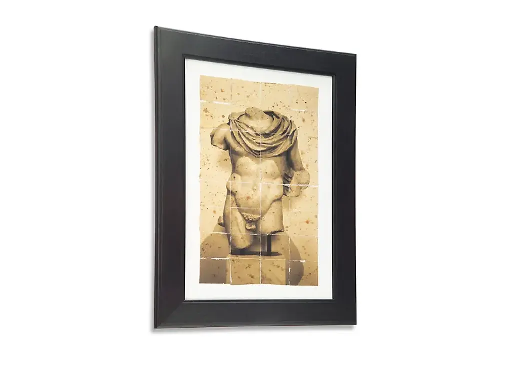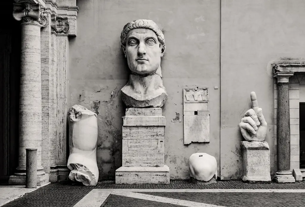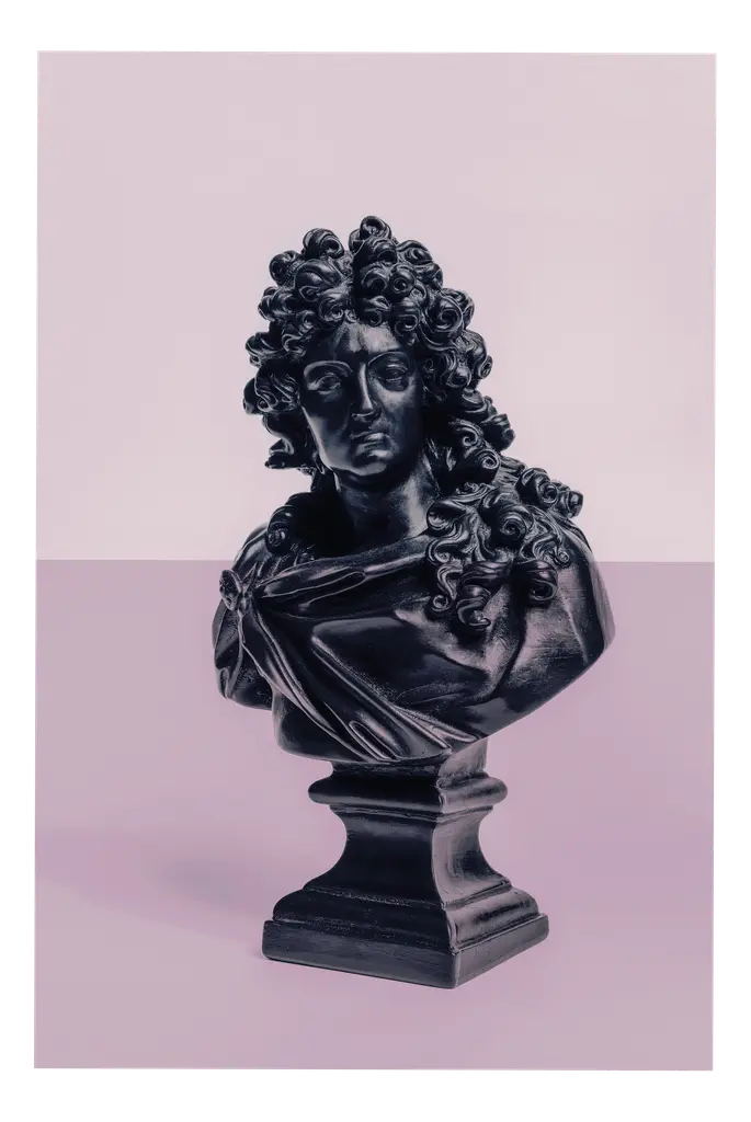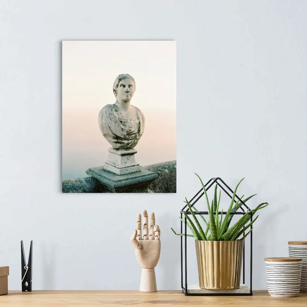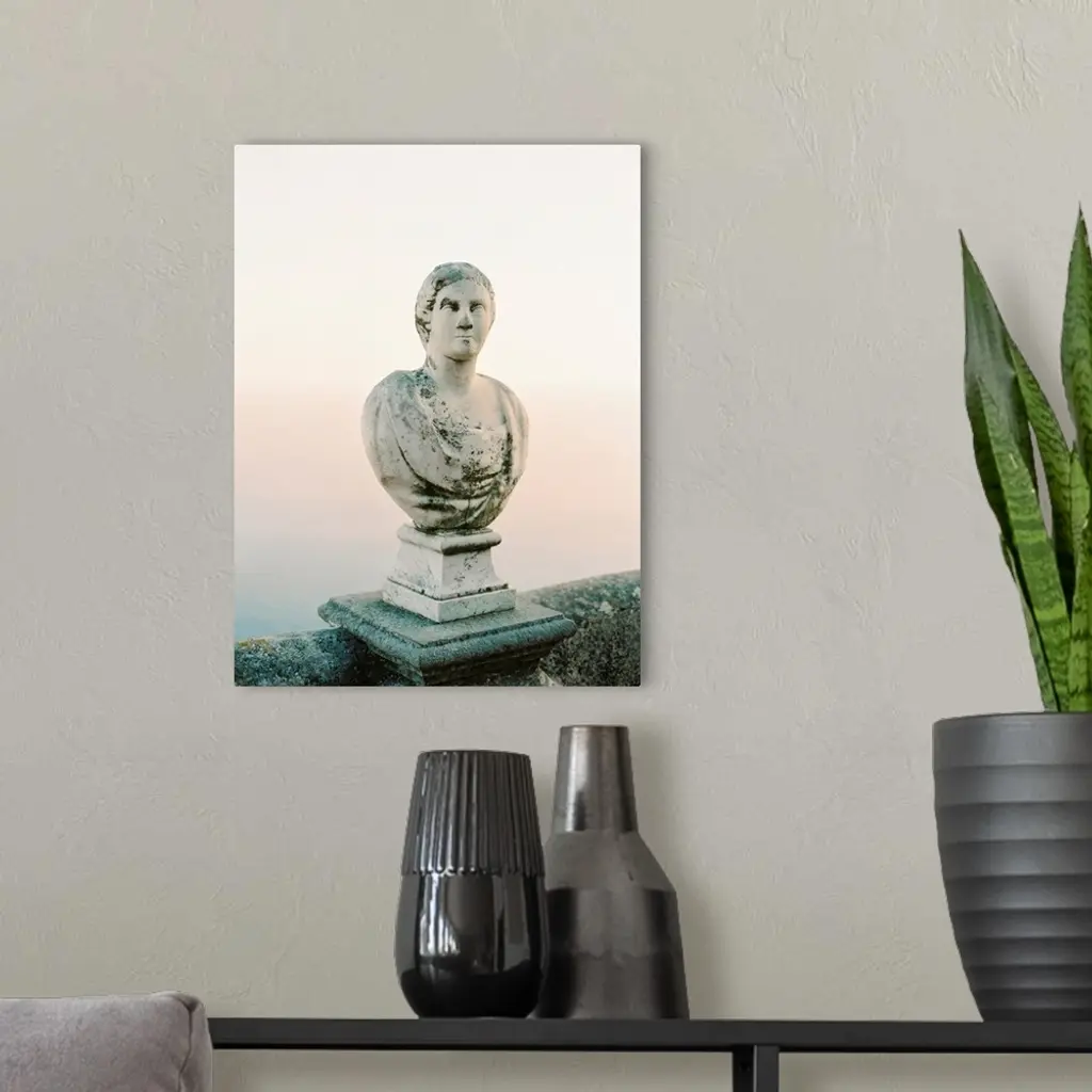 A photograph of a simple, classic bust statue on a stone railing, Lake Como, Italy.