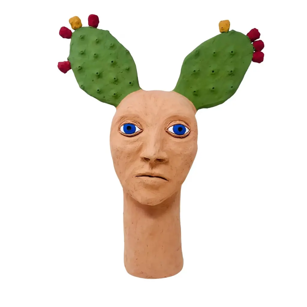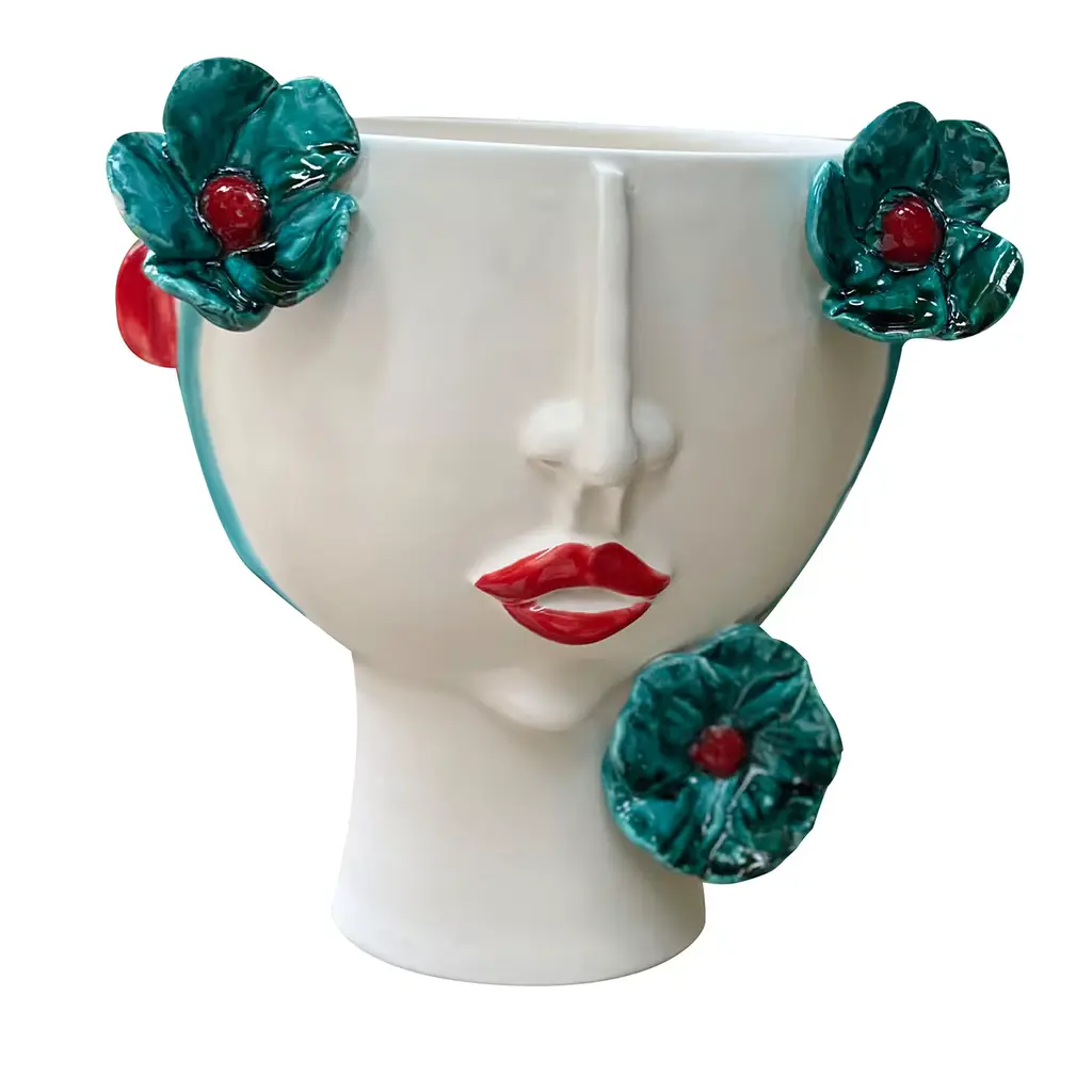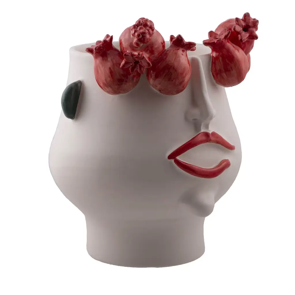 Testament to the Sicilian tradition of Moor's head reinterpreted in a stylish contemporary key, this ceramic head can be used as a flower pot or decorative sculpture for indoor and outdoor settings of any style inspiration. Adorned with a wreath of vivid red pomegranate applications matching the lively shade of the subject's lips, it is enameled in a delicate cream tone and enriched with green details.