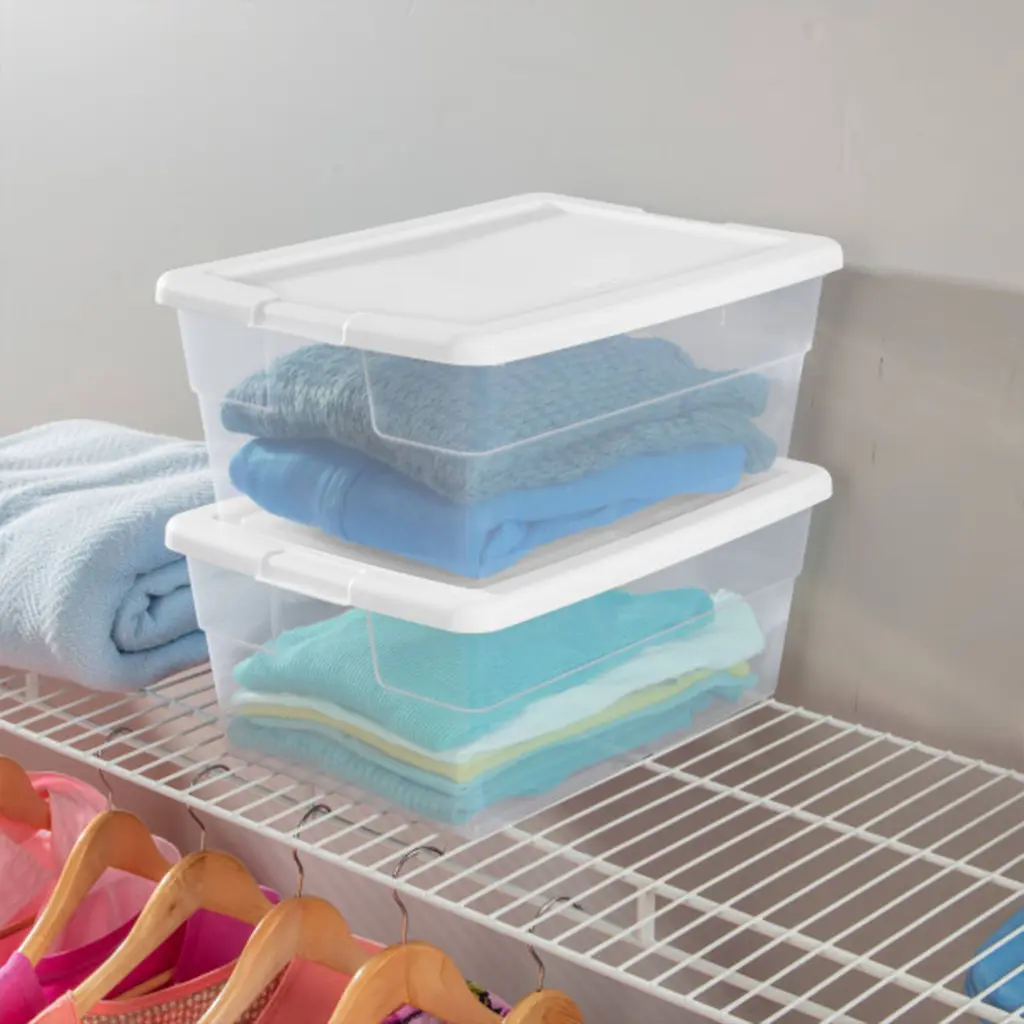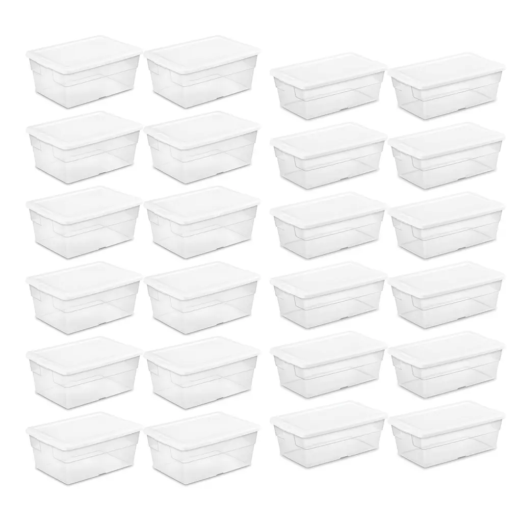Bring total organization to your home storage system with the Sterilite 12 sets of 16-quart Latch Totes and 12-pack of 12-quart Latch Totes. These versatile storage solutions help you streamline and declutter your living spaces while maintaining a tidy and accessible environment. With 12 sets of 16-quart totes and a generous 12-pack of 6-quart totes, you'll have ample storage capacity to cater to a wide range of needs. These totes are crafted with quality and durability, ensuring they stand the test of time and hold up to everyday use. With robust latches that attach the lid securely to the base, you can ensure the contents remain safe while stored. The see-through base allows you to confidently store items of varying sizes, from clothing and bedding to seasonal decorations and household essentials, knowing they'll remain dust-free and organized. The straightforward design of the totes allows for quick and easy identification of their contents, eliminating the need for guessing or rummaging through boxes. The totes are designed to stack on each other, making excellent use of verticle storage space without the hassle of wondering what items are in which tote. With 2 included sizes, you can store a wide range of items, whether packing away extra towels, sweatshirts, or books or preserving keepsakes and knick-knacks. This set of latched lid storage boxes is ideal for storing your belongings in the basement, garage, and attic, and won't buckle, break, or leak in non-insulated environments. Enjoy a new storage and household management system with the 12 Sets of 16-quart Latch Totes and 12-pack of 6-quart Latch Totes from Sterilite. Set of 24 storage totes creates a full home storage system for storing everything from decorations to craft supplies to newspapers or small keepsakes Clear bins allow for easy visibility of stored items preventing you from having to search multiple totes for the item you're looking for Ergonomic tight sealing lids keep bugs, dust, and dirt out with a heavy-duty seal while allowing for easy opening and closing Indented lids and contoured bases allow for stacking and provide access to untapped verticle storage space in your home Ideal for keeping crafting supplies, office supplies, creative projects, or keepsakes in a garage or basement Set includes: (12) 16-quart totes, (12) 6-quart totes Material: Plastic Color: Clear Dimensions 16-quart (L x W x H): 16.75 x 11.90 x 7 inches Dimensions 6-quart (L x W x H): 13.63 x 8.25 x 4.88 inches Weight: 1.4 pounds (16-quart) Weight: 2 pounds (6-quart) Manufacturer warranty: 1-year warranty