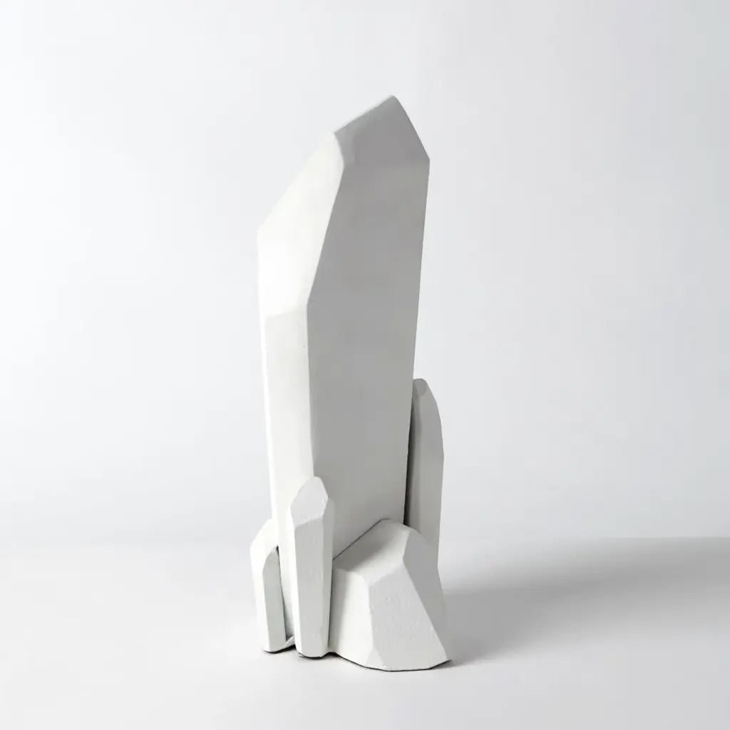 The Arete Collection is renowned for magnificently carved and hand-crafted home furnishings. This exclusive collection for William D Scott consists of nature-inspired accessories. This cast aluminum sculpture is covered in a matte white finish and resembles a quartz-like stalagmite. Felt tabs on the bottom of the sculpture help to protect any surface this piece rests upon.