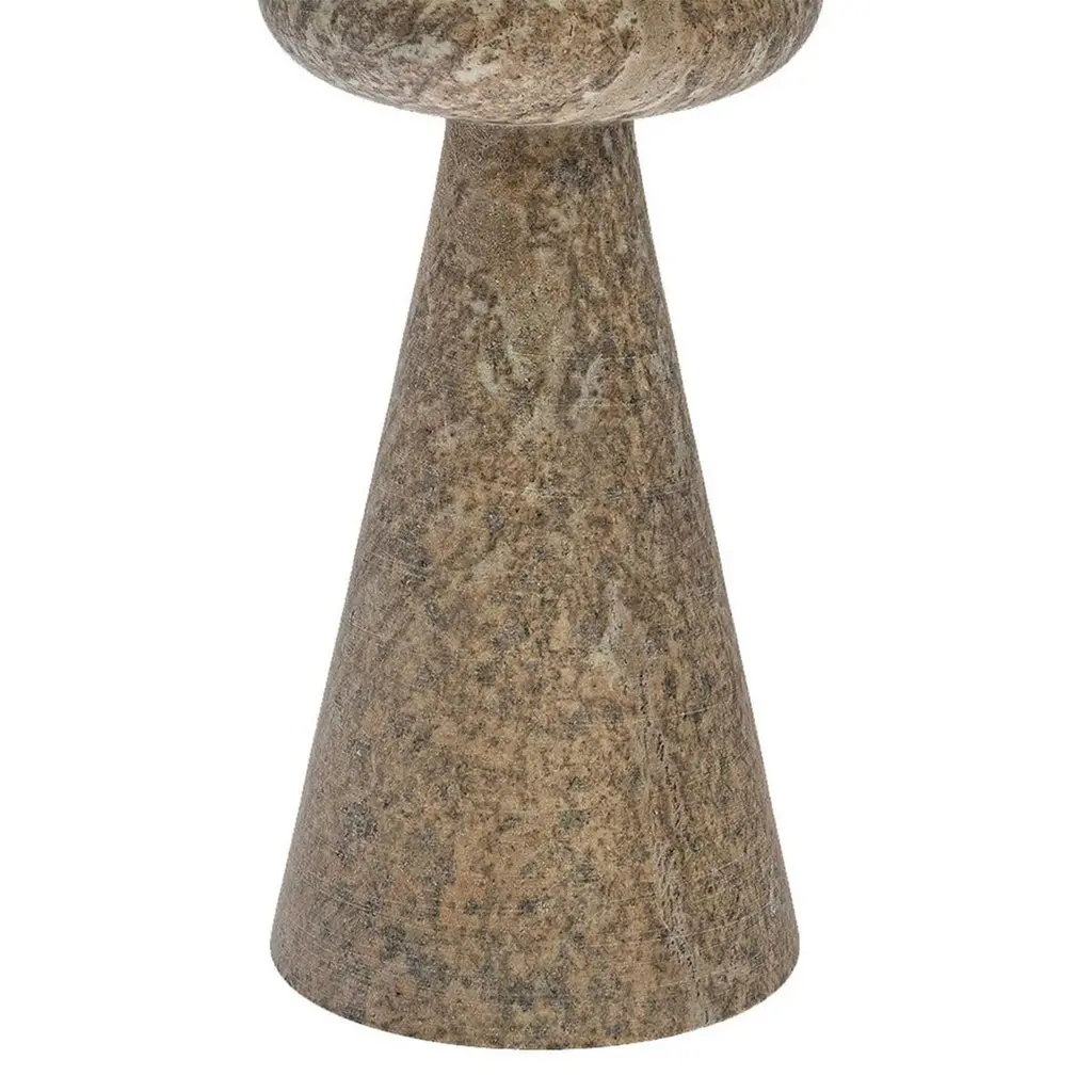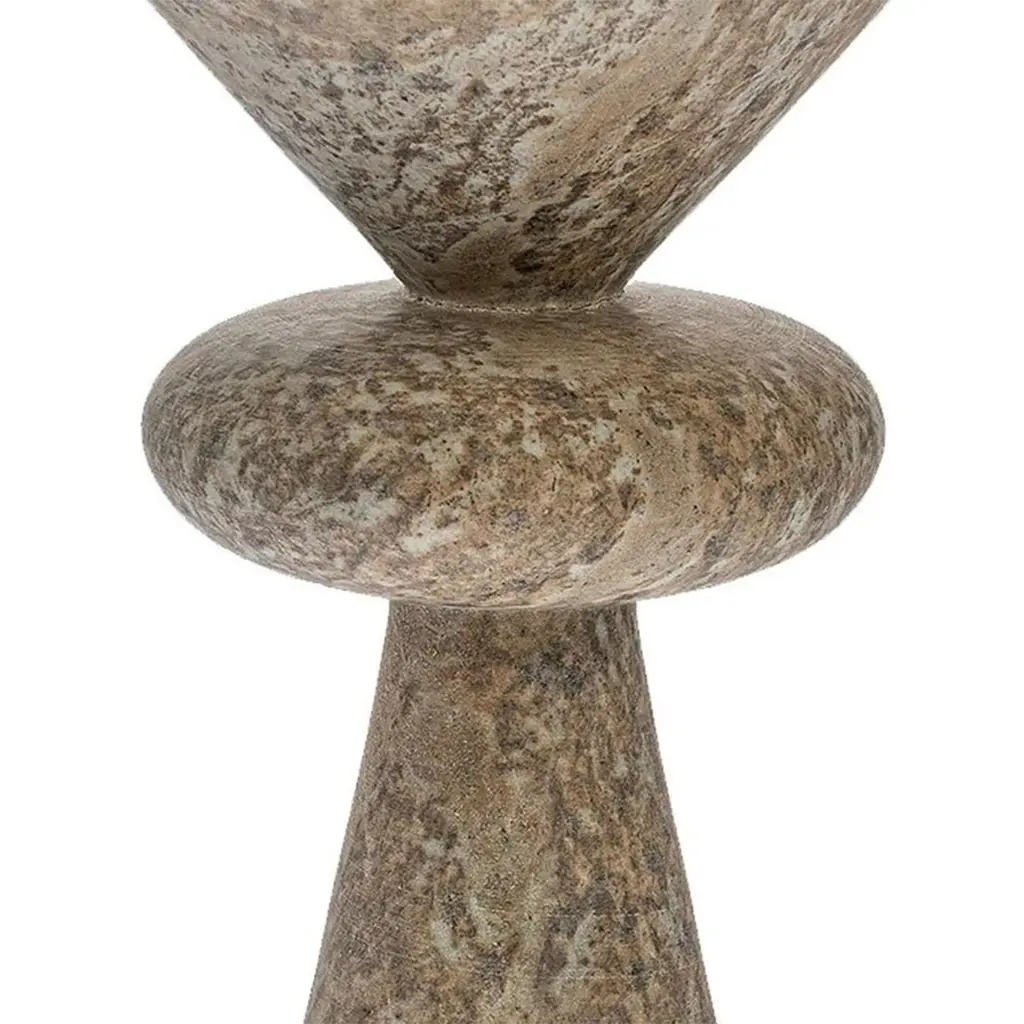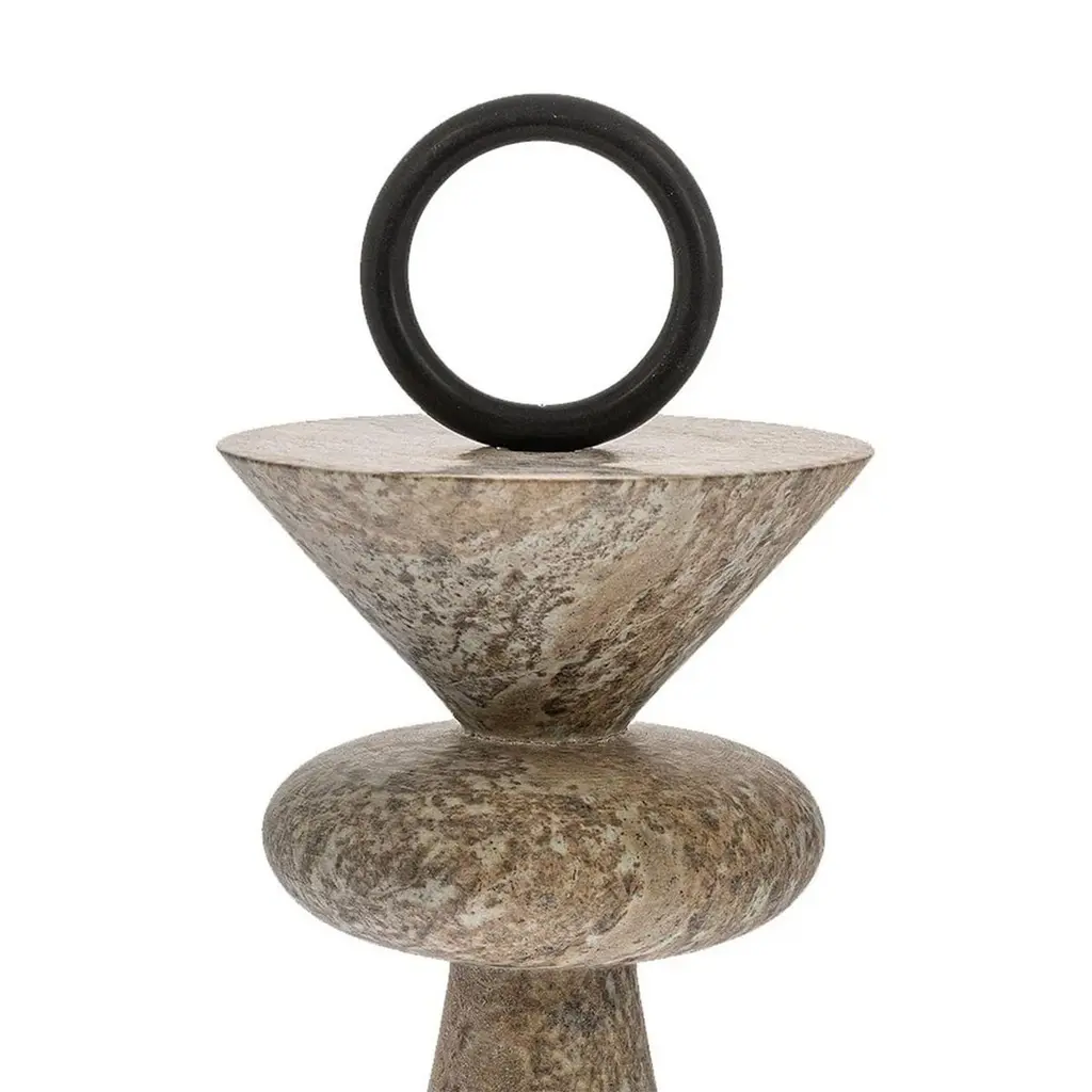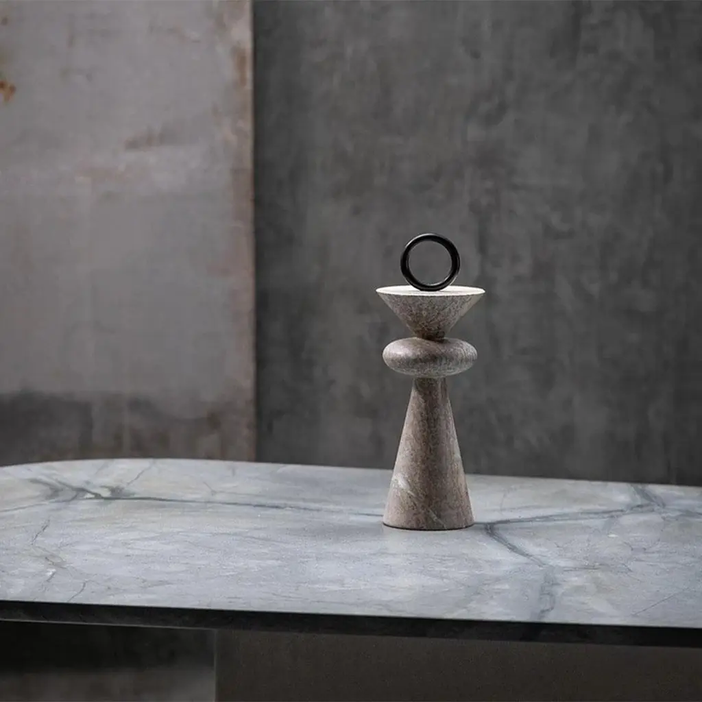 Sculpture stone Totem B made with soapstoneand with carbon steel ornaments. Totem realizedby milling soapstone into geometrical shapes.