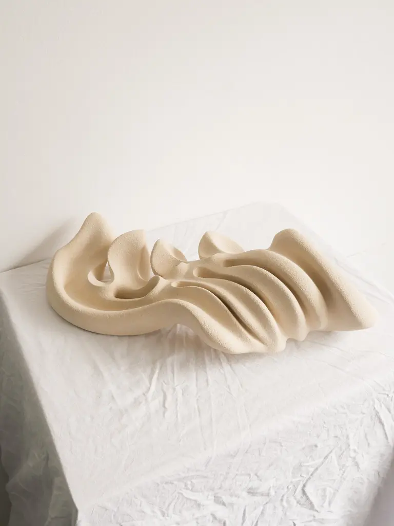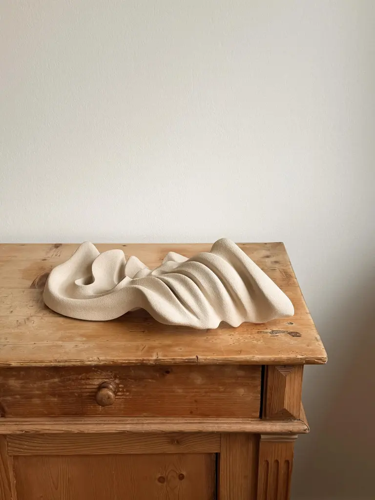 Stoneware Clay, Ceramic Tides of Serenity Sculpture by Aleksandra KrasnopolskaDimensions: W 43 x D 20 x H 14 cmMaterials: Stoneware clay. Unglazed ceramic sulface.Weight: 2,6 kg.Collection: “Ocean”Aleksandra Krasnopolska is a contemporary artist from Odessa, Ukraine. Aleksandra worked as an architect and interior designer before turning to sculpture. When she picked up clay for the first time, she fell in love with the material. "The most amazing thing is how easy and beautiful I did it the first time, how pleasant and facile the clay was," she says. "It was love at first touch!" Krasnopolska's sculptures are biomorphic, seeming to slide and shift as you walk around them. Krasnopolska's work evokes the beautiful female form, as well as the waves of the Black Seas, where Aleksandra draws so much of her inspiration. The sculptures are made using a process that the artist refers to as "flow art." Every piece is a form of meditation.